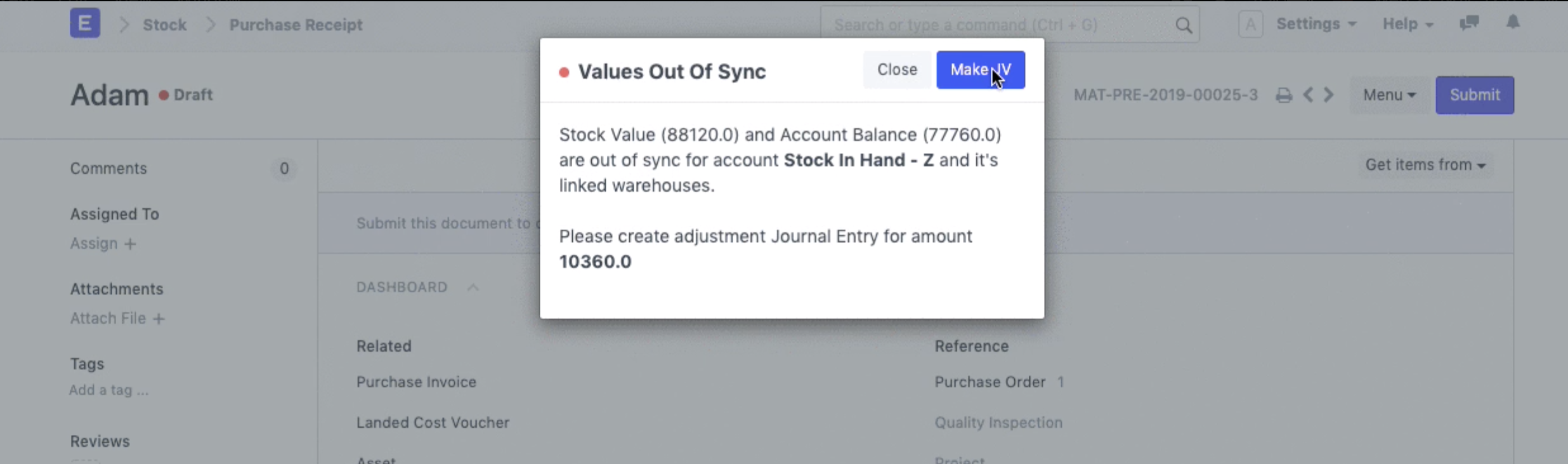 To proceed forward, you can easily sync the stock balance and stock accounts balance by creating a Journal Entry. Click on “Create a Journal Entry Button“ in the validation message, update relevant accounts and submit Journal Entry.