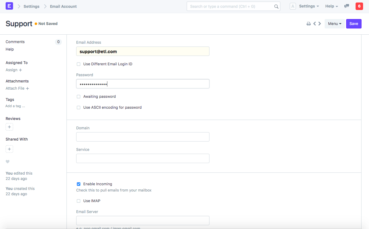 First, we need to setup an email account that appends the incoming emails received there into the "Issue" DocType of Mjara ERP.**1) Create an Email Account:**You need to update email domain and setup your support email address in Mjara ERP's Email Account. To learn about email setup, please check out this link