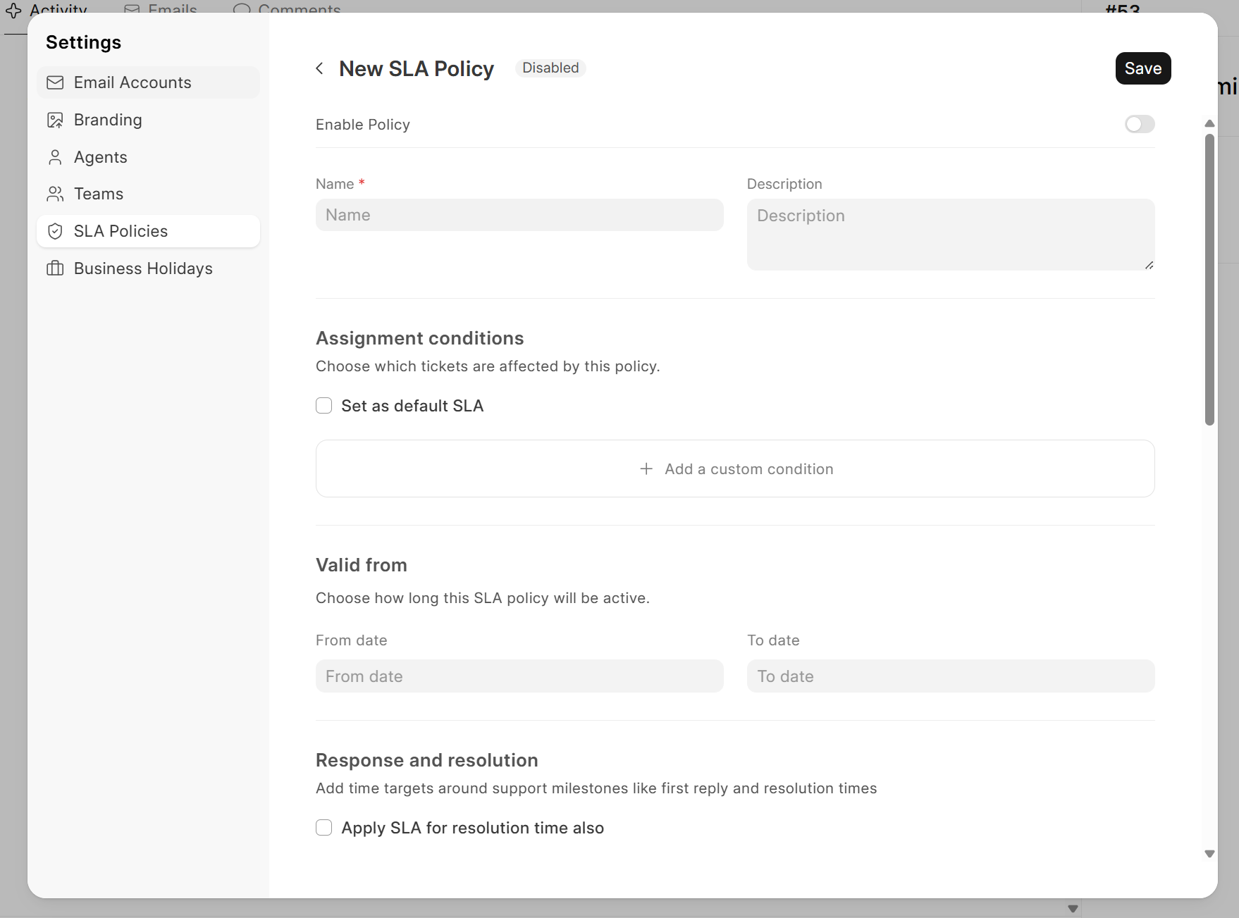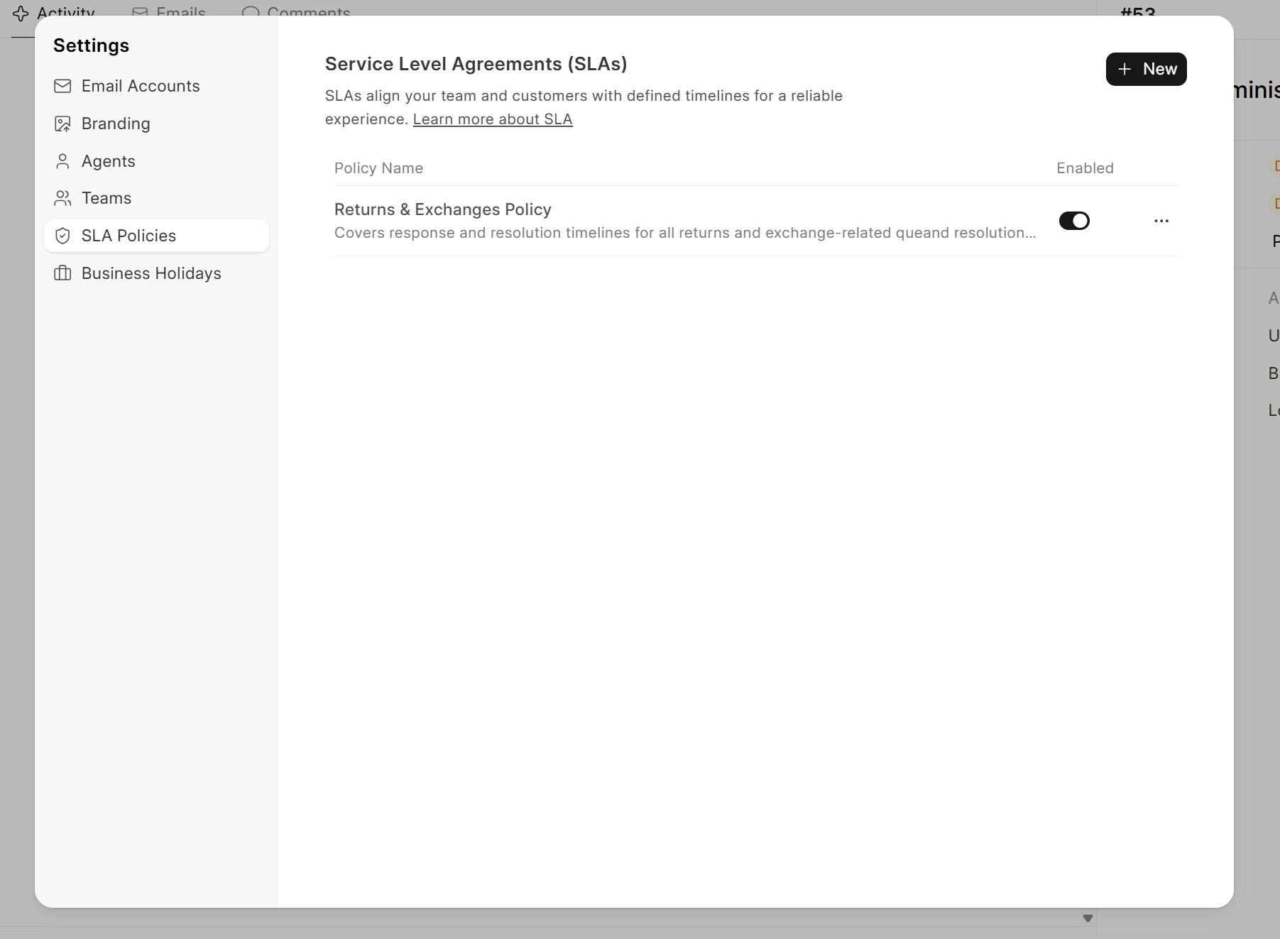 - SLA Policies: Click on "SLA Policies" in the left sidebar and click "New" at top right corner