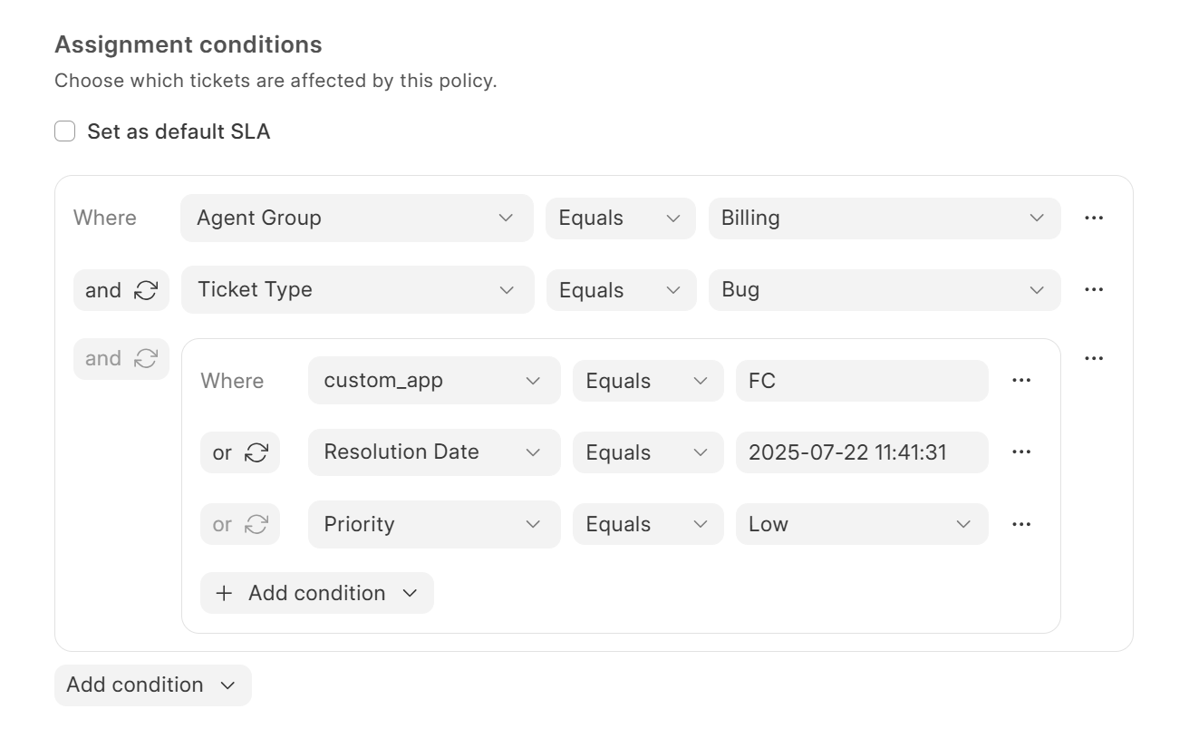If no SLA condition matches a ticket, the system will apply the SLA marked as Default. This ensures fallback coverage.