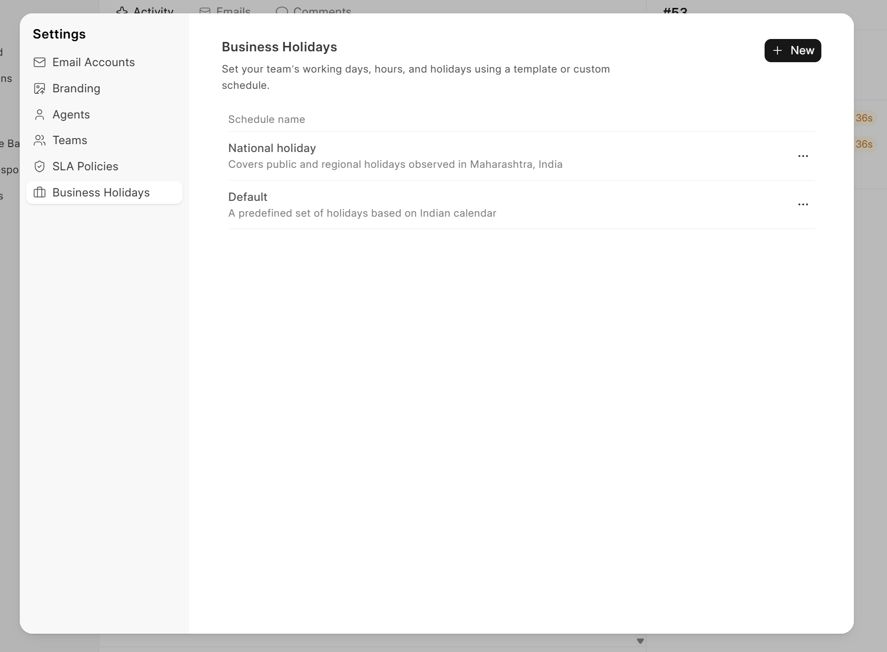 - Business holidays: Click on "Business holidays" in the left sidebar and click "New" at top right corner