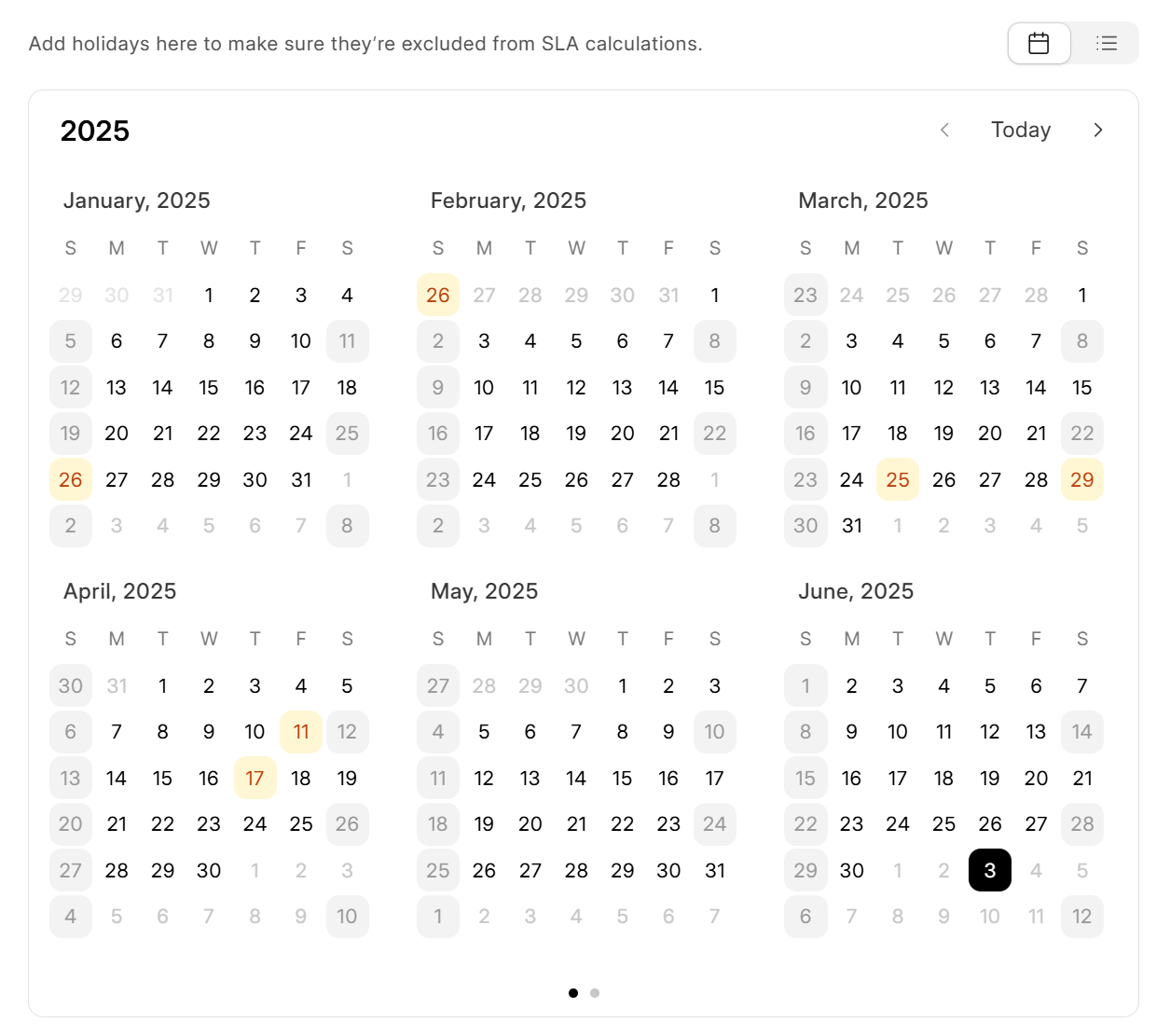 Holidays and recurring holiday can be viewed from calendar view, where holiday dates are represented by light yellow and orange background, recurring holidays are represented by grey background.