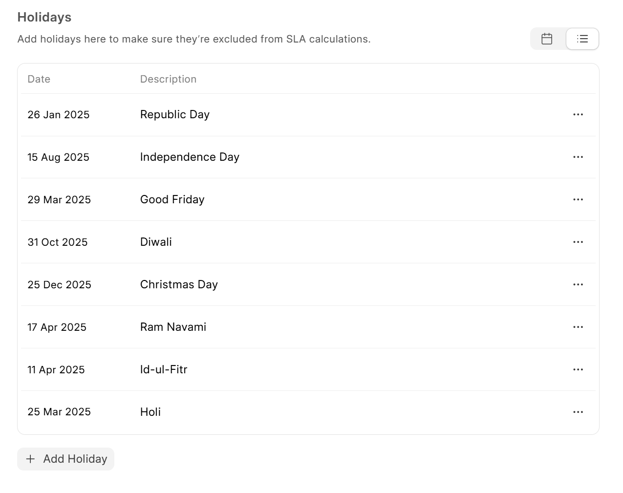 You can link a Holiday List to exclude specific dates from SLA time tracking (e.g., public holidays). SLA timers will automatically pause on the dates included in the selected Holiday List.