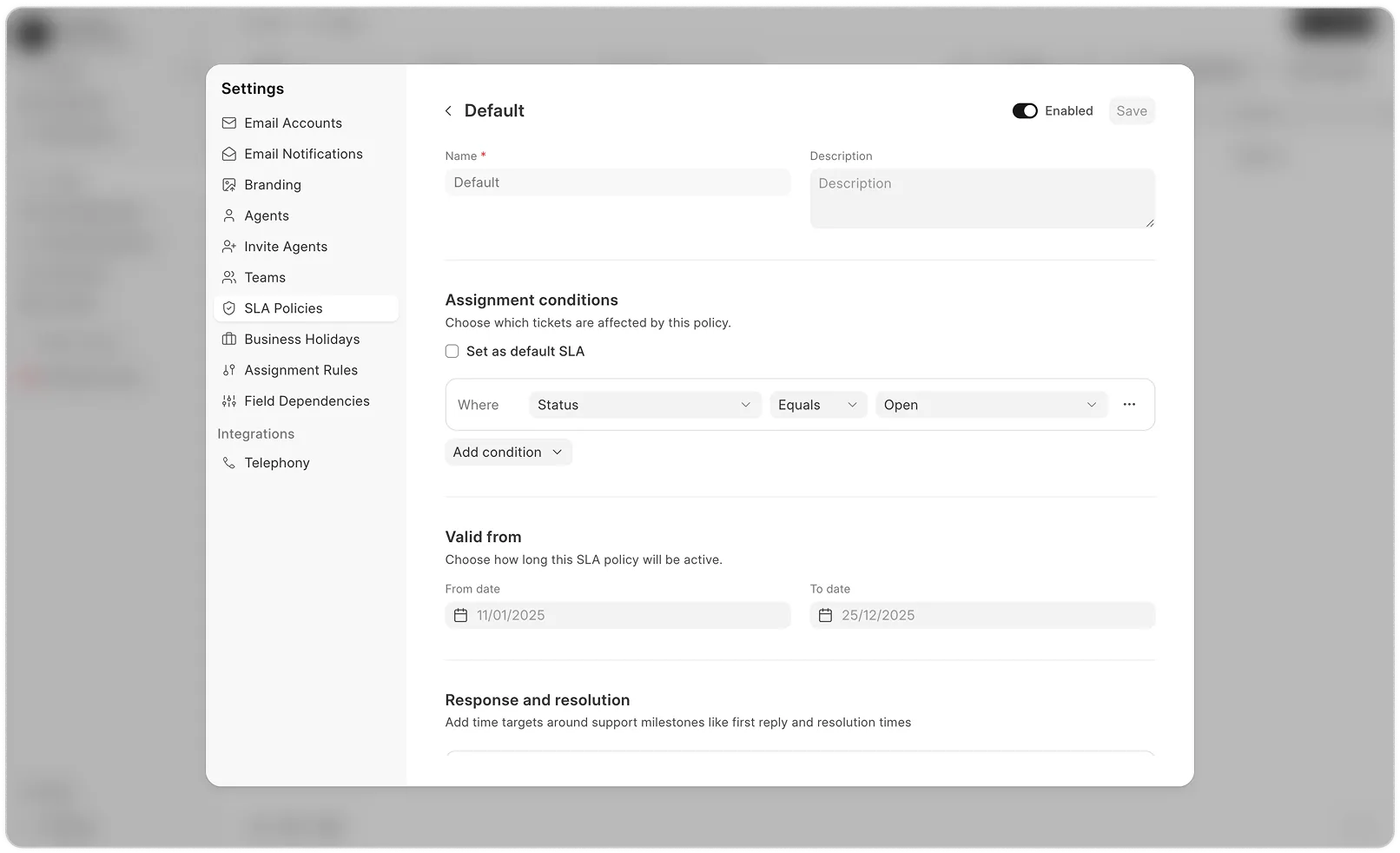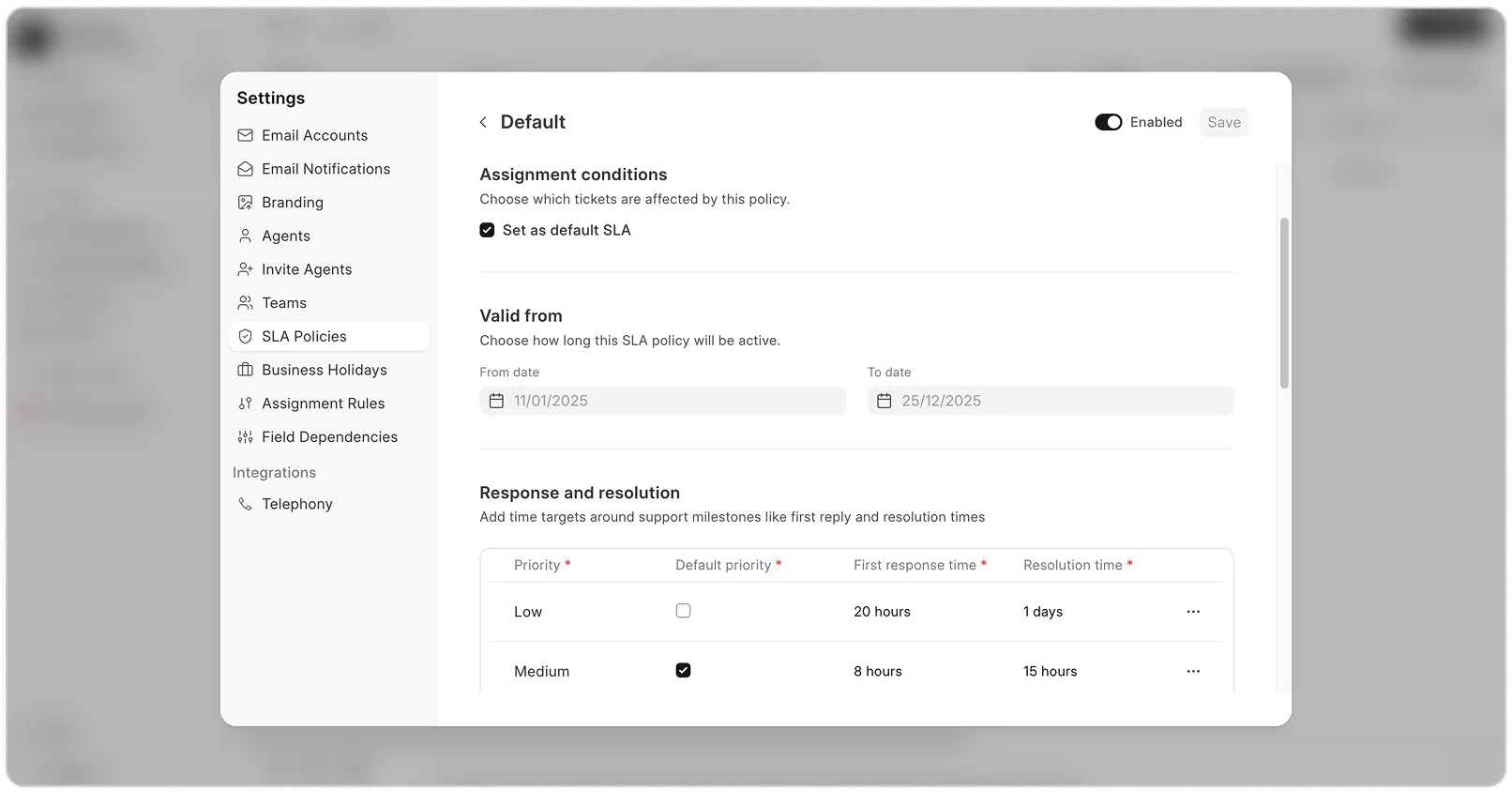 Set First Response and Resolution times by priority (High, Medium, Low)