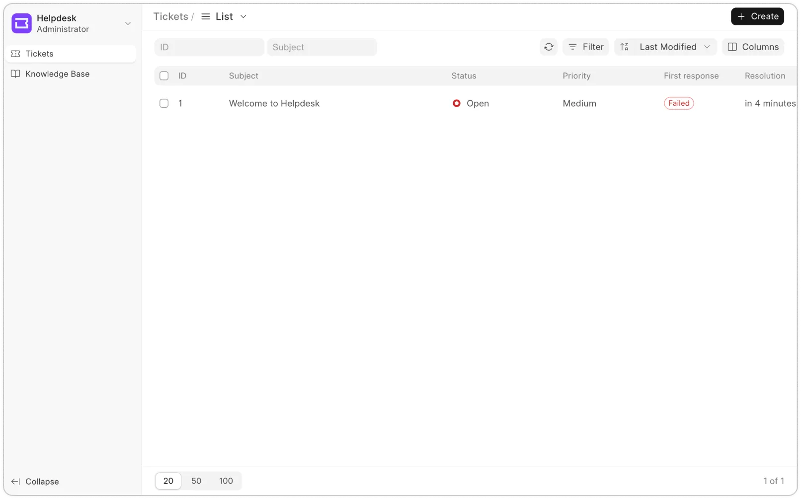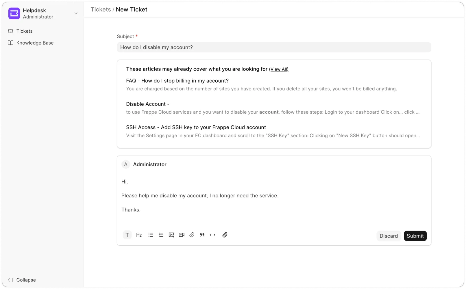 If you have help articles created, your customer should be able to see recommended articles based on subject they’ve typed. Once they’ve created the ticket, agents should be able to see the ticket in the Agent view as well where they work on resolving it. Customers can track SLA and see replies inside the ticket (as and when the Agent responds).