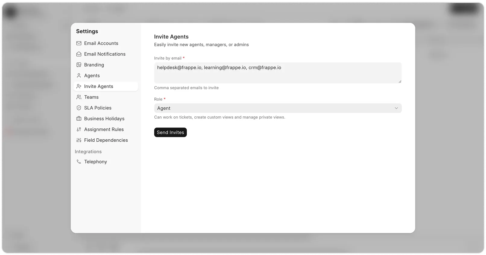 Now that you have your email account set up, add your team so they can start replying to tickets. Go to Invite Agents, and add the emails of the agent you want to invite, select the role and click on the "Send Invites" button.