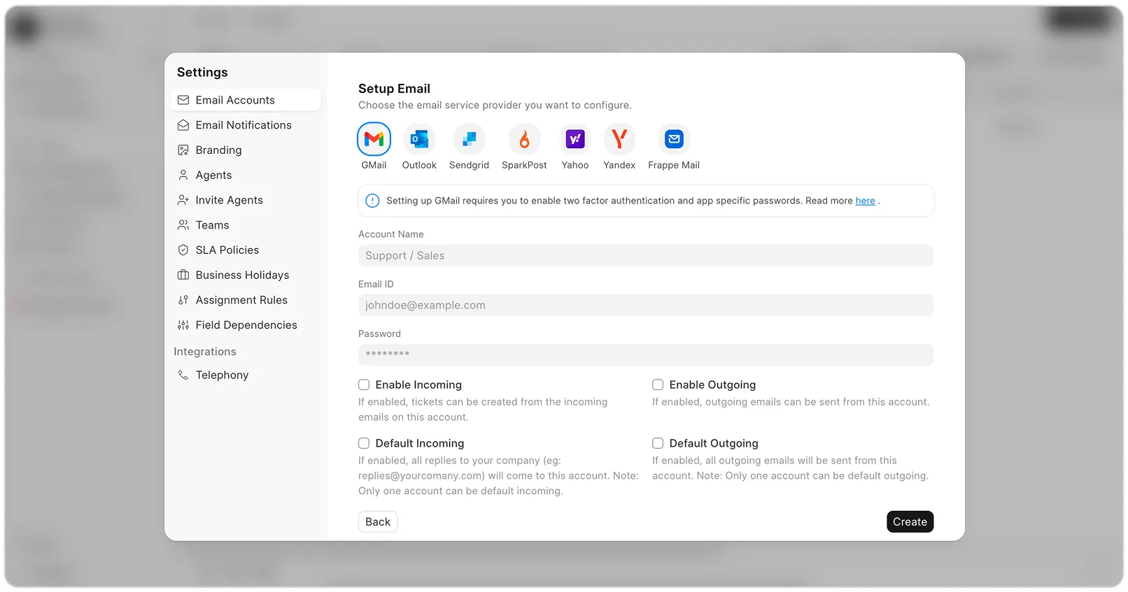 If you want your customers to raise tickets via email (e.g., support@company.com), set one of your email accounts as "Incoming" or "Default Incoming." All emails sent to this address will automatically become tickets every 10 minutes.