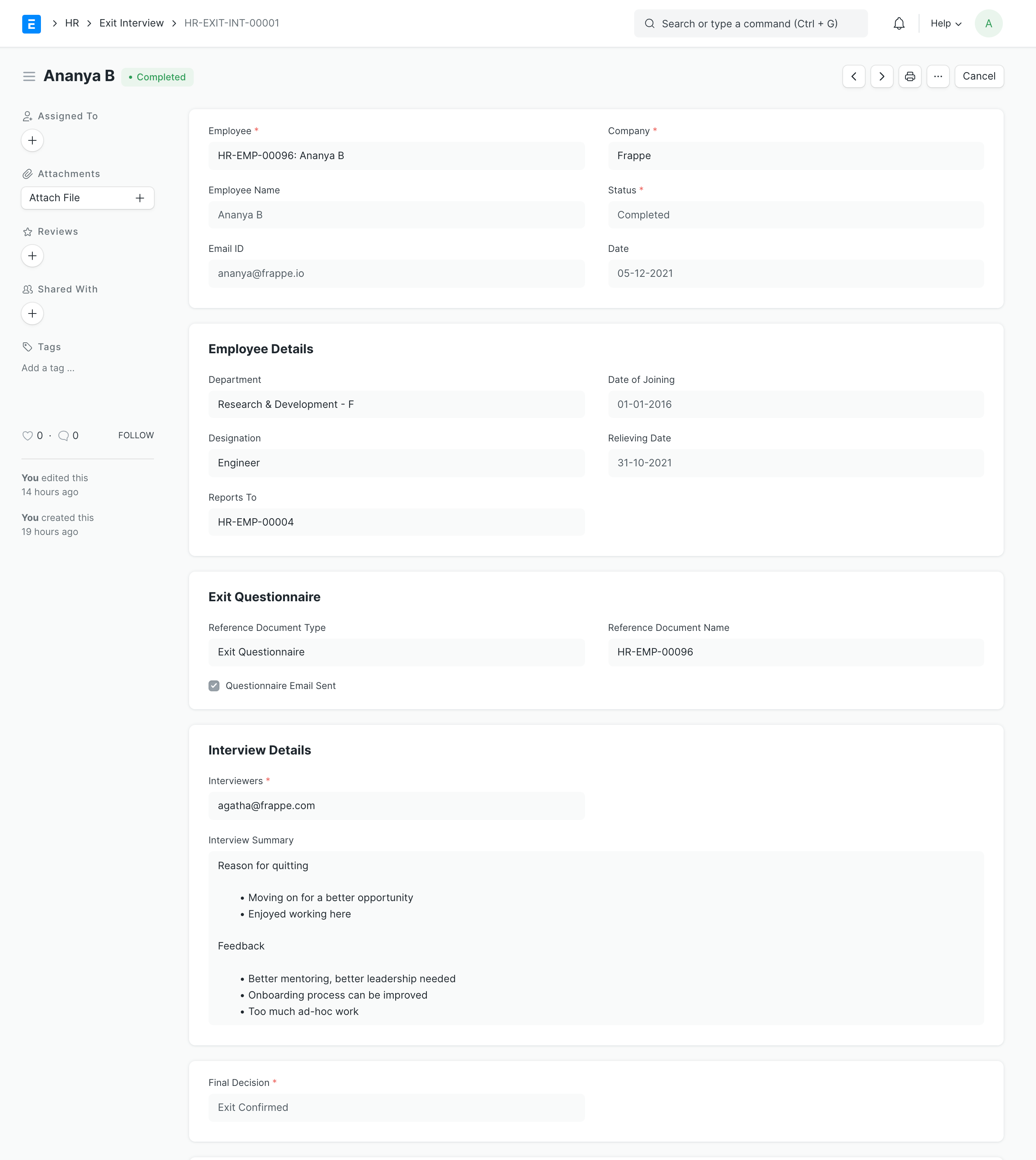 Human Resources > Employee Exit > Exit Interview