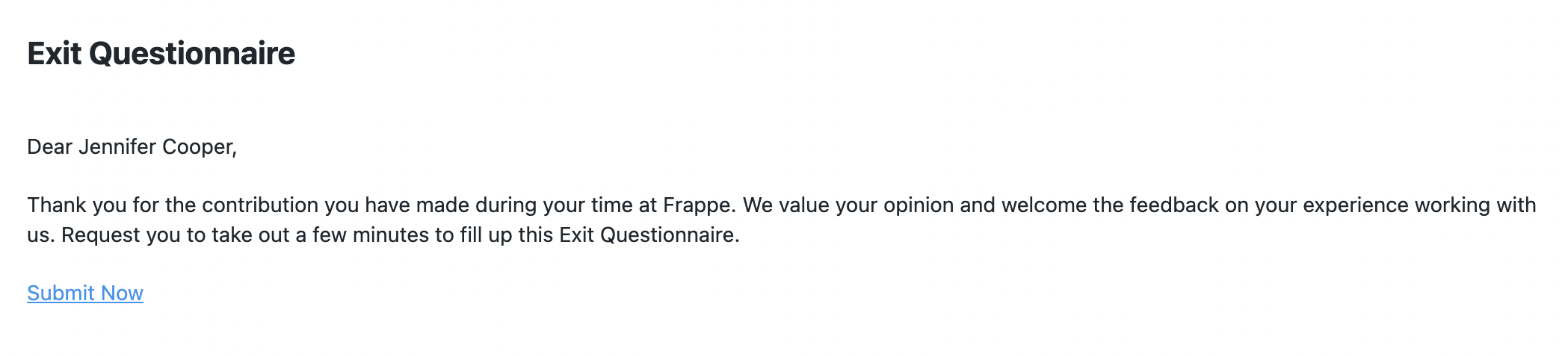 4. In the Exit Interview document, you can see a button Send Exit Questionnaire. This will send an email to the Employee with a link to the web form as per the email template set in HR Settings.