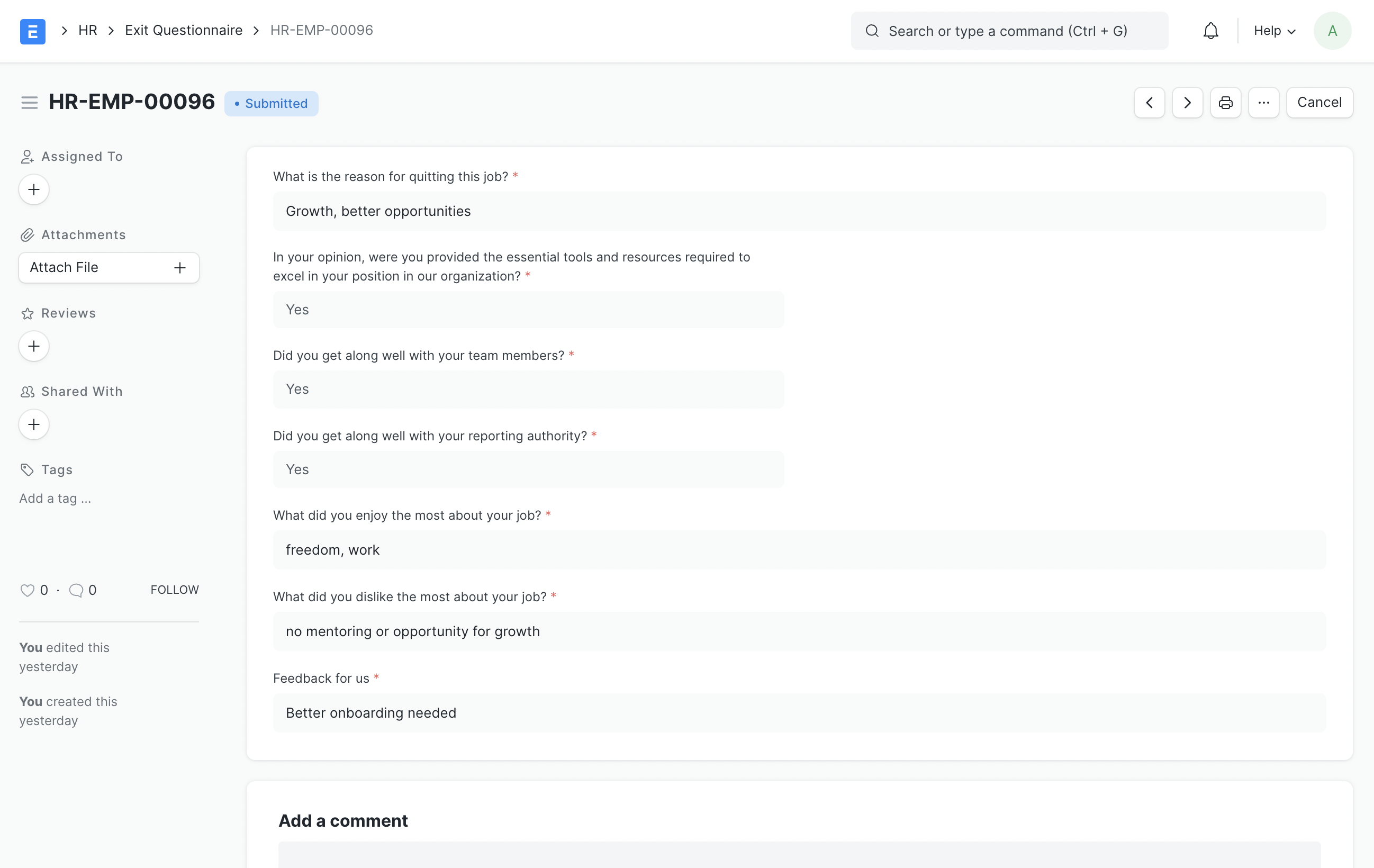 5. Once your employee fills up this questionnaire, you can link it to the Exit Interview document.