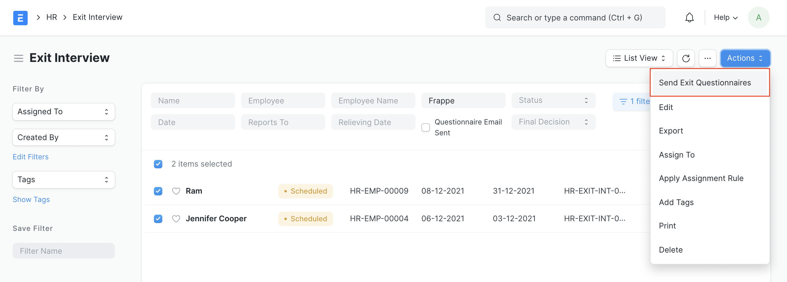 6. If you want to send Exit Questionnaires in bulk to multiple employees, you can select the employees from the Exit Interview list view and click on Actions > Send Exit Questionnaire. This will send the exit questionnaire emails and provide you with a summary of the emails sent.