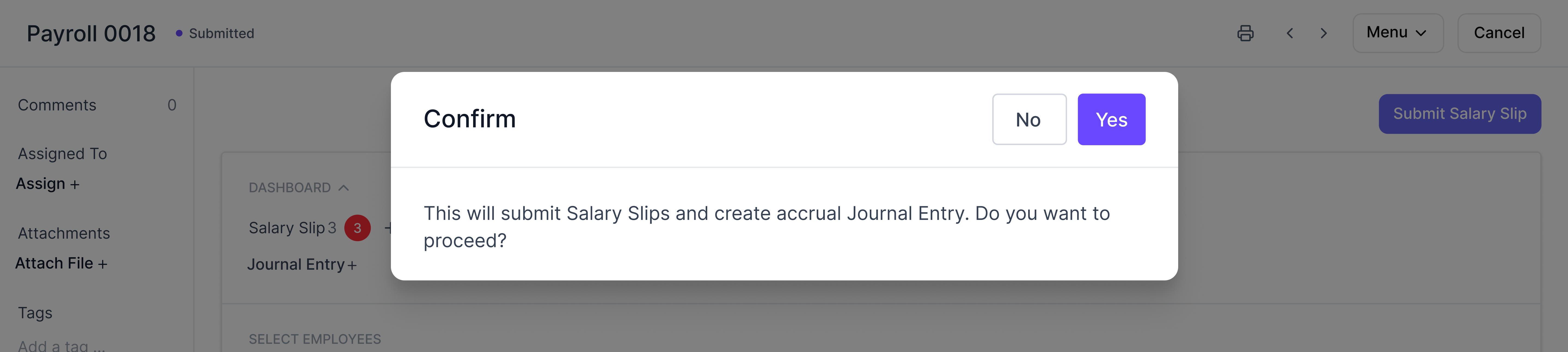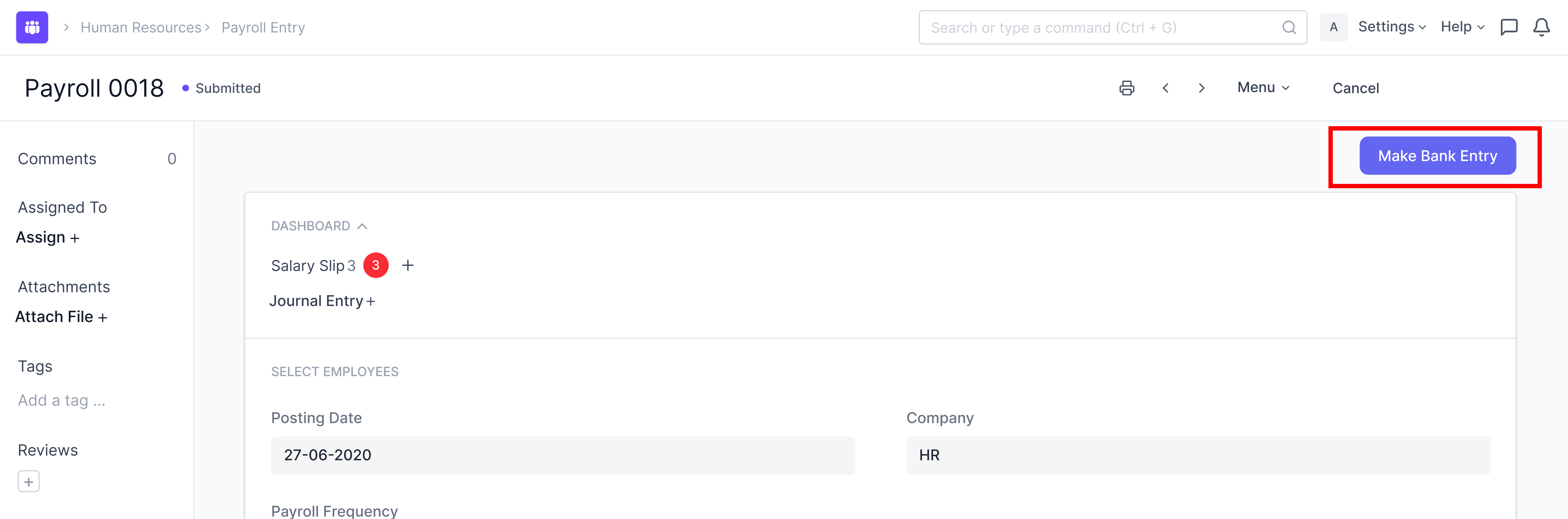 You can verify the draft salary slips and then submit them via the payroll entry. On submitting the salary slips, an accrual journal entry will be created. This means we are booking the salary expenses in the system and not paying them.