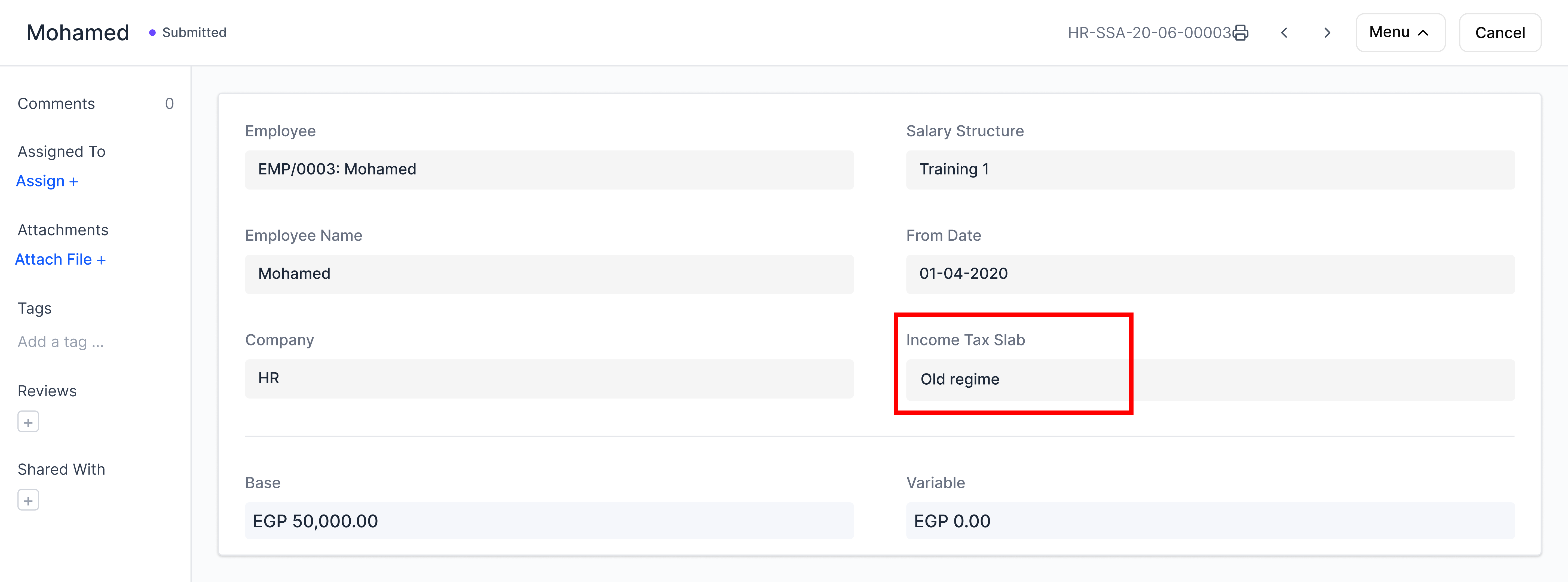 Once the salary structures have been created, you need to assign it to employees. If you miss this step, then you will not be able to proceed further. During assignment, you have to select the Income Tax Slab (if you have multiple slabs), since the percentage deduction of Income Tax will be calculated based on the same. You can also define a base amount if your salary structures are based on formulas.