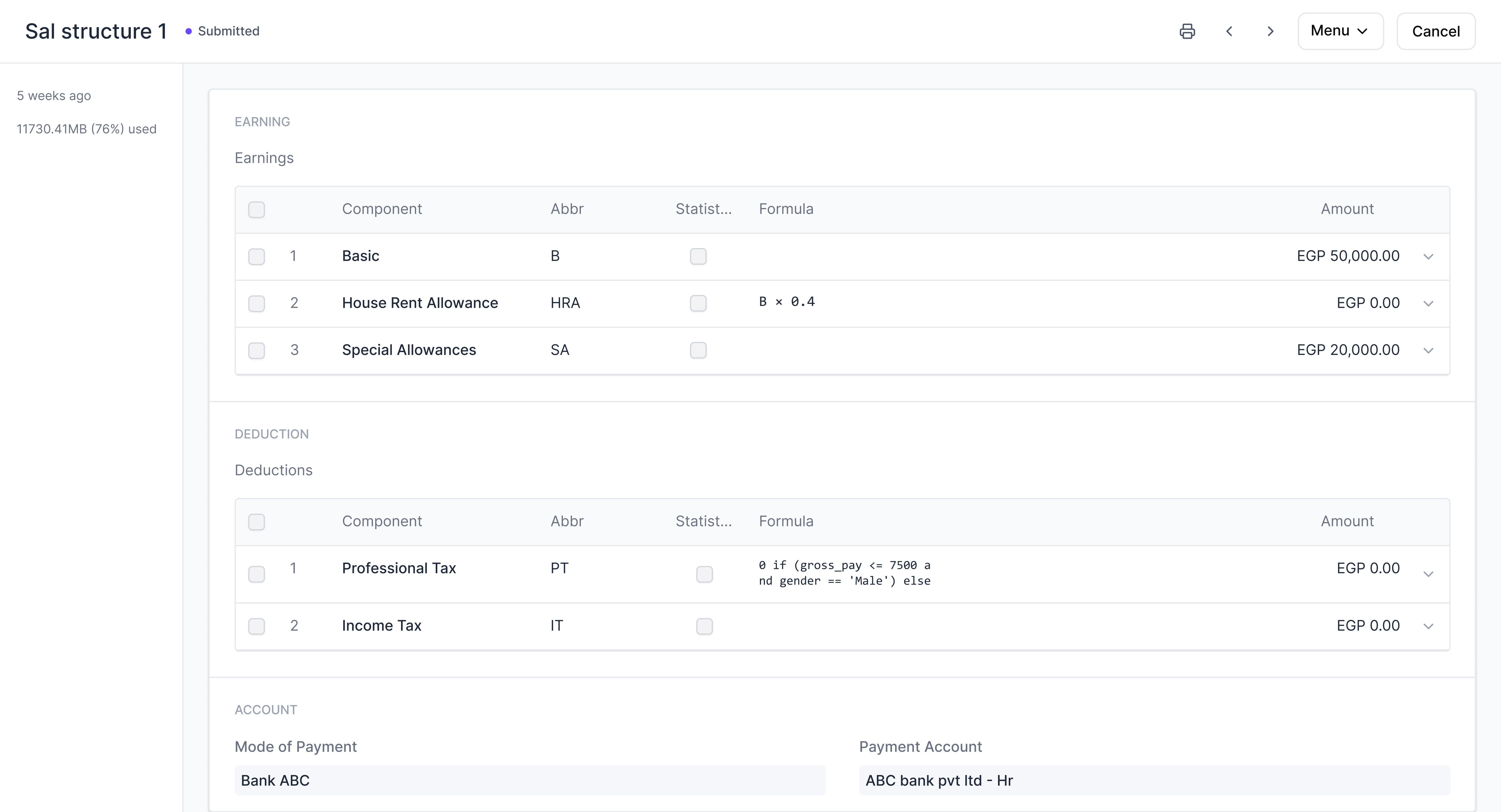 Once you have created all the salary components, you can define a salary structure. You can also define whether the salary is based on timesheets. You can add the earnings and deductions as per your choice and the mode of payment.