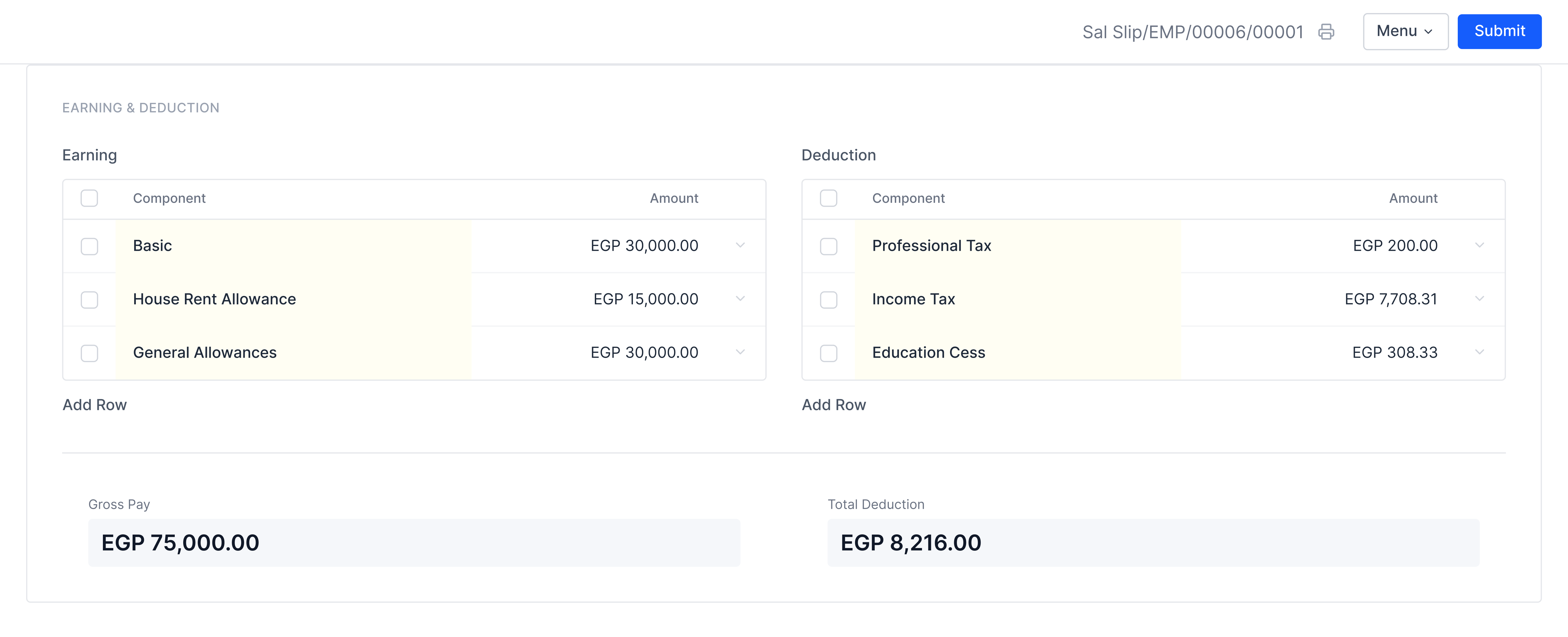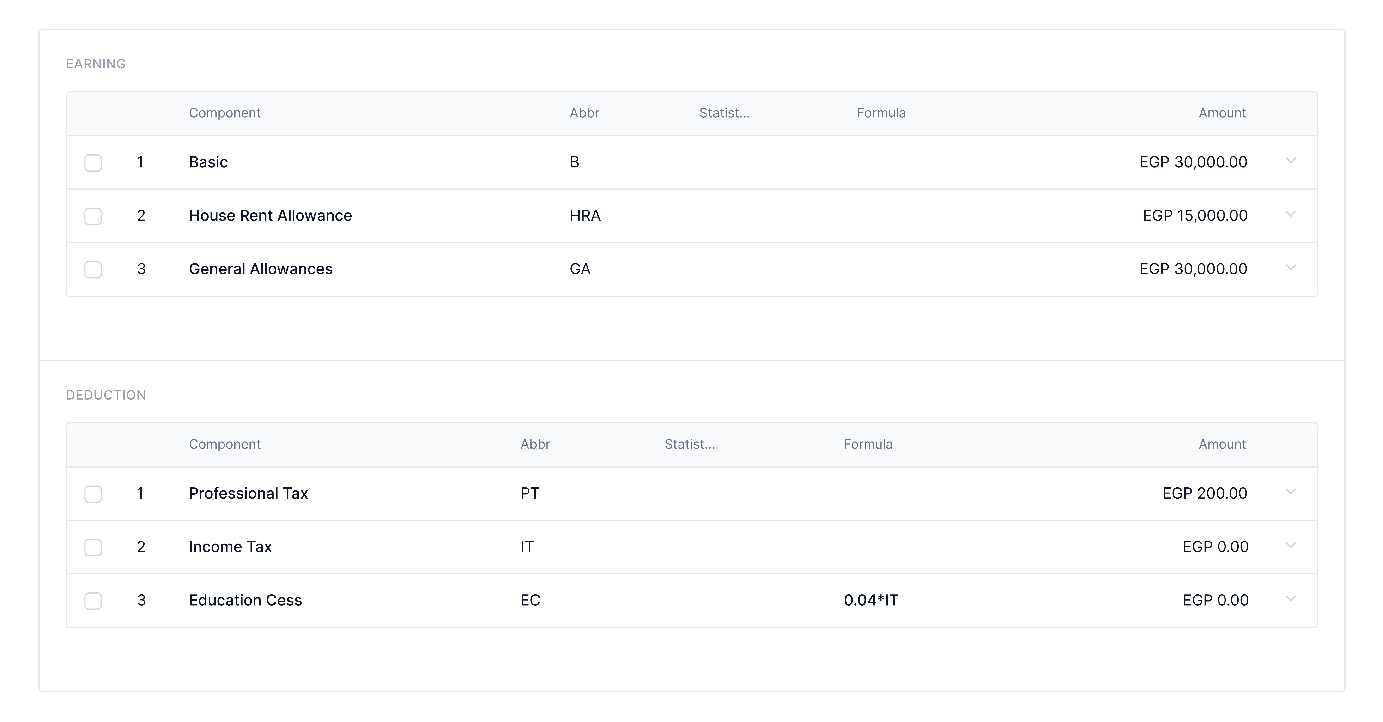 - Create a salary structure and add Income Tax in the deduction section leaving the amount section blank. Along with that kindly add Education cess which will be based on a formula. Screenshot attached: