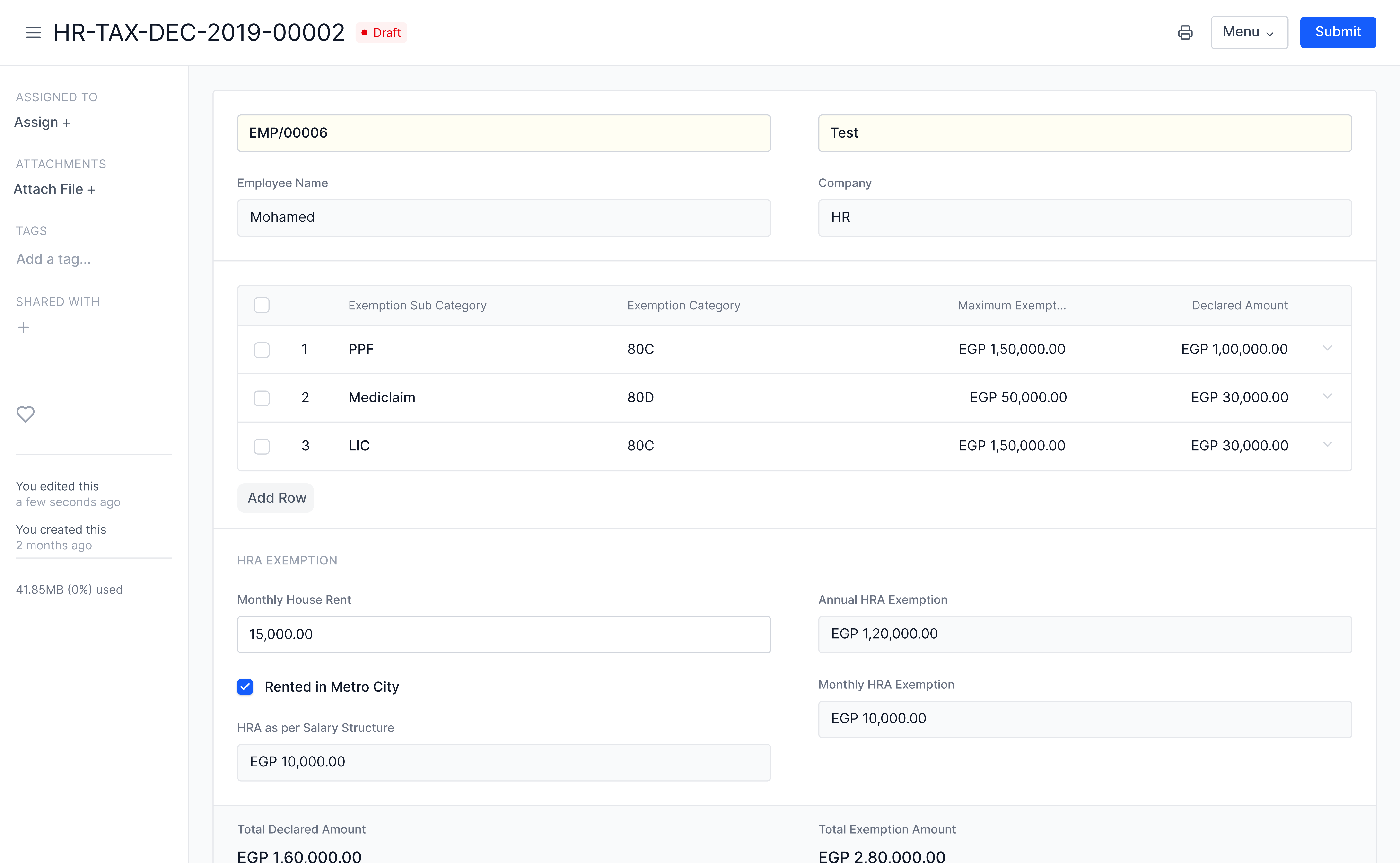 - If an employee has any kind of investments or tax declarations such as PPF, insurance, mutual funds, HRA, etc., add these in "Employee Tax Exemption Declaration". Screenshot attached: