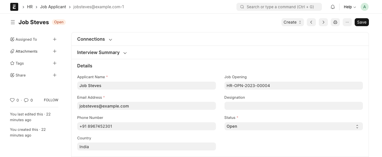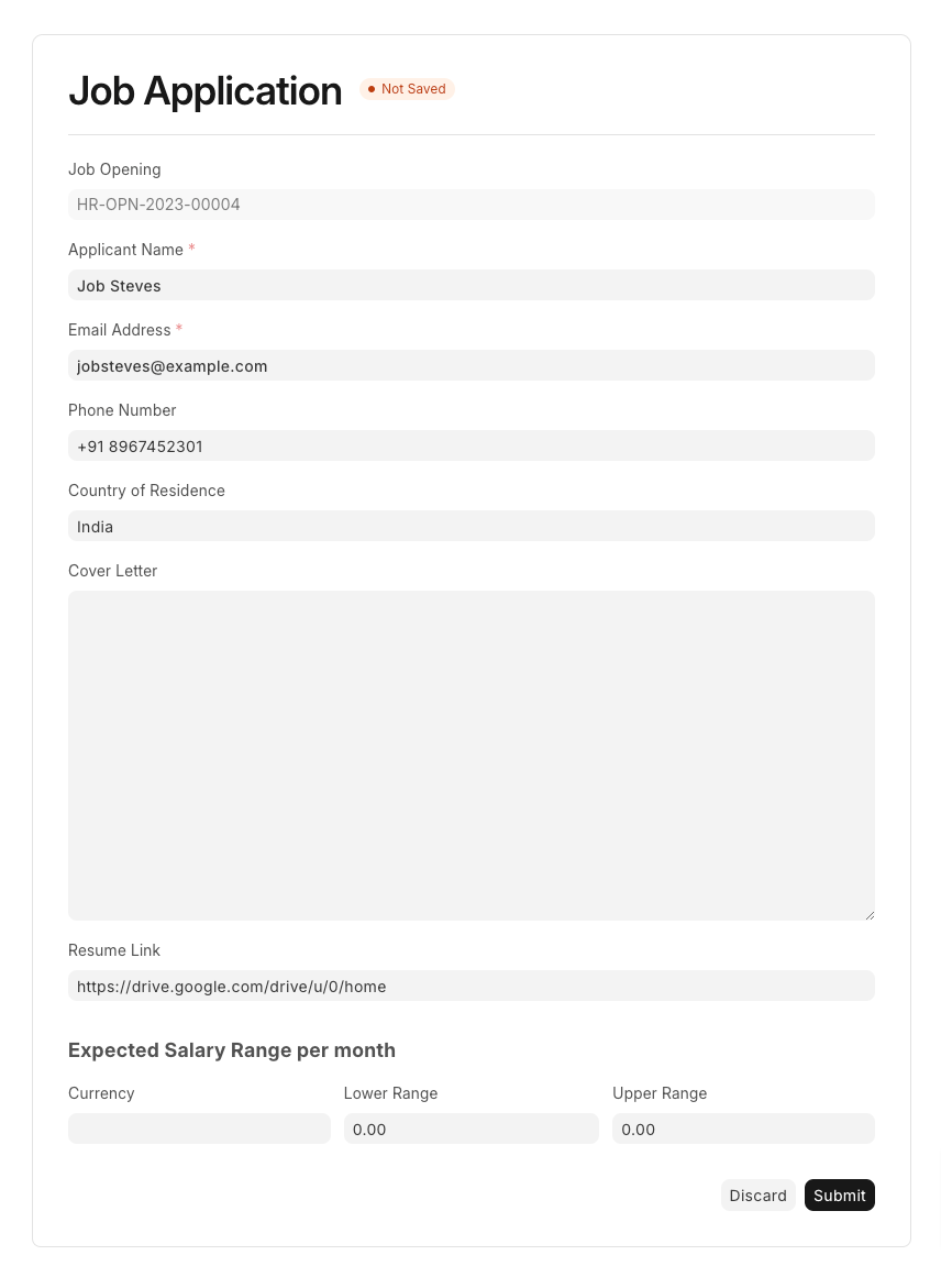 5. Fill in the appropriate details and click on Submit. This will result in the creation of the corresponding Job Applicant document.