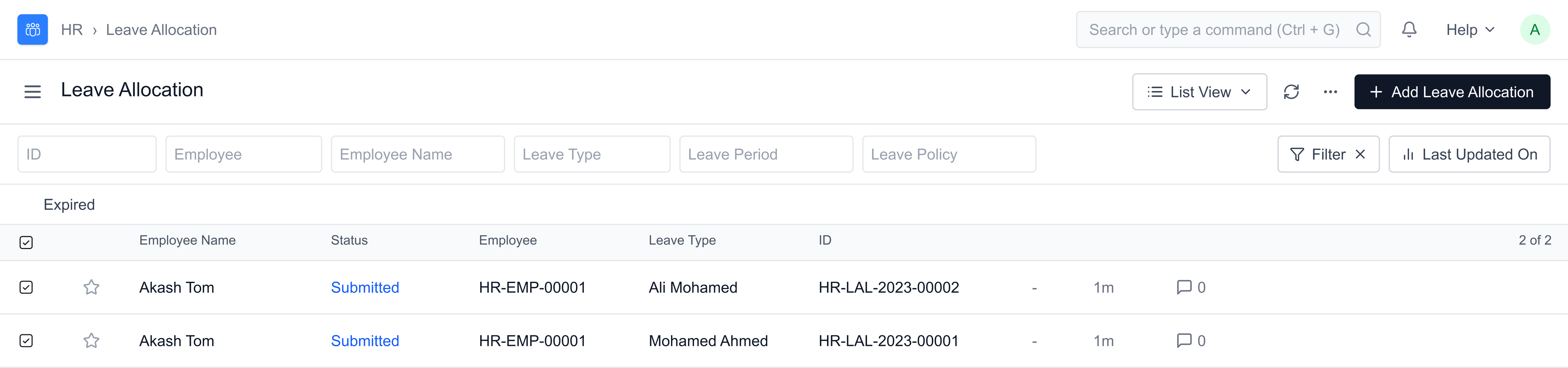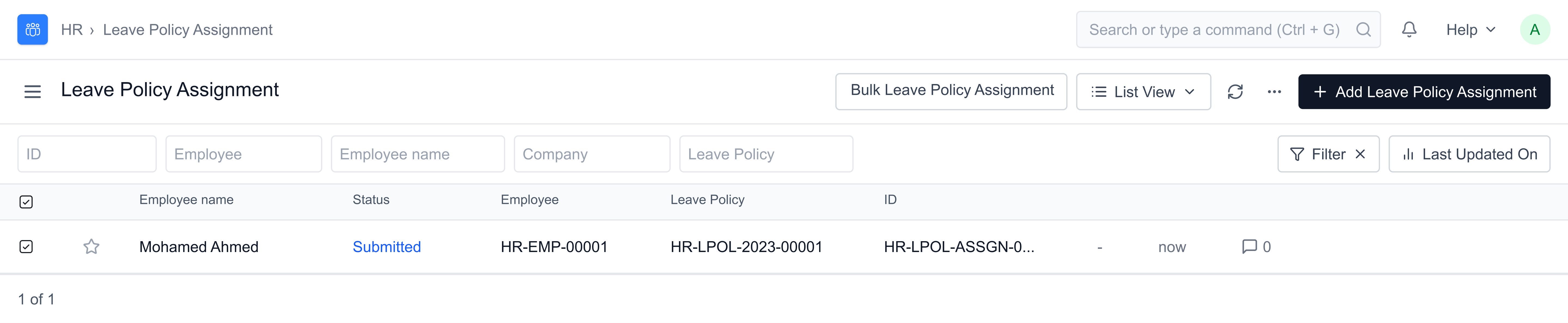 Leave Policy Assignments and Leave Allocations made using the Leave Control Panel are reflected in their respective DocTypes as shown below: