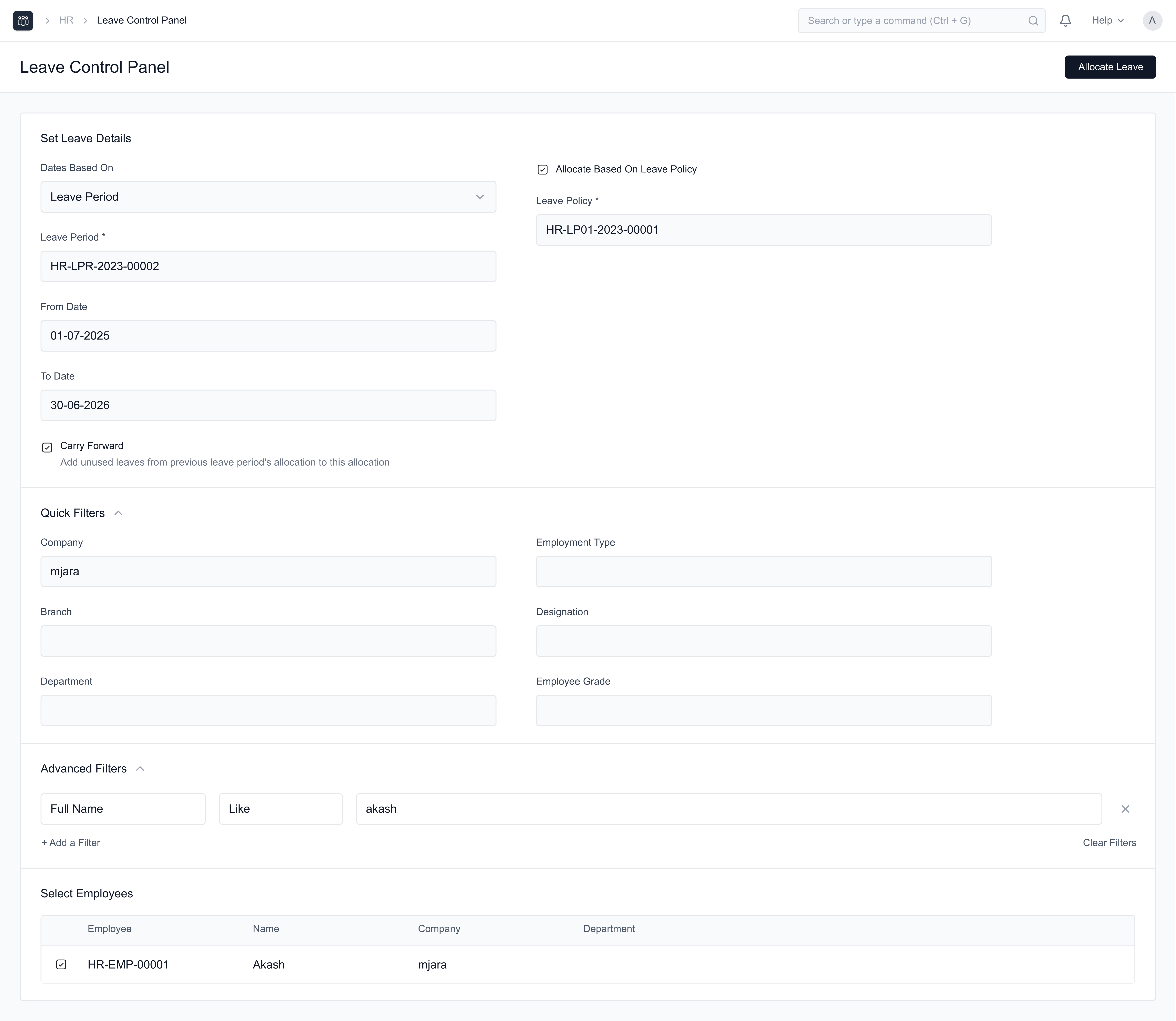 The Leave Control Panel allows you to allocate leaves in bulk based on a specific Leave Policy or Leave Type.