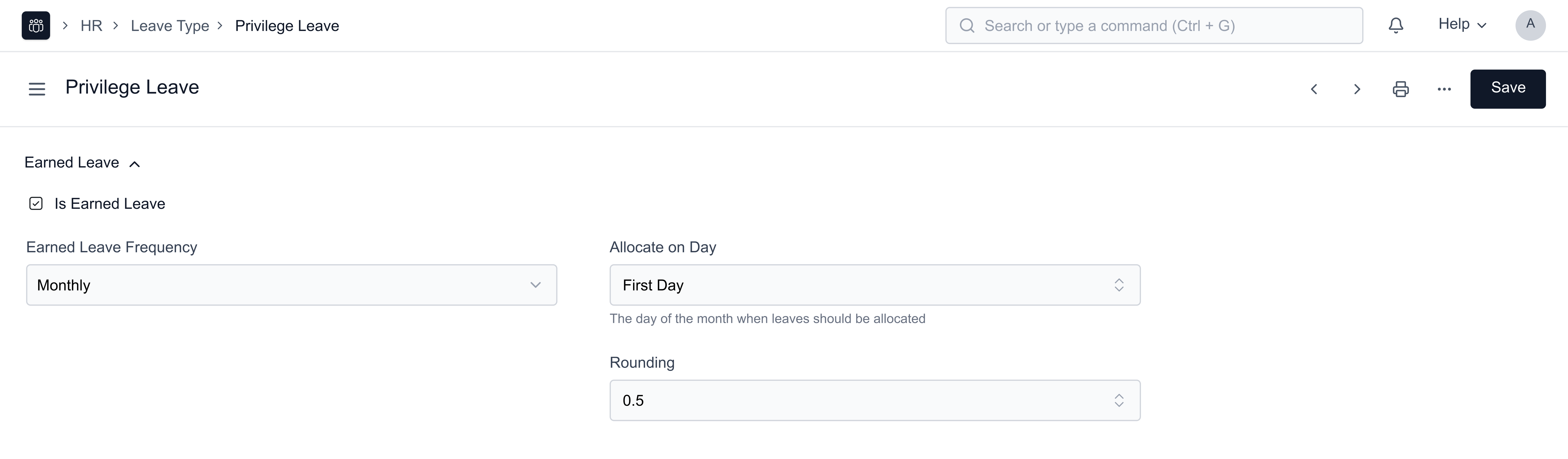 Note: The initial allocation of this Leave Type will be 0. Leaves will be updated at the end of the Month (or as per the 'Earned Leave Frequency' set).