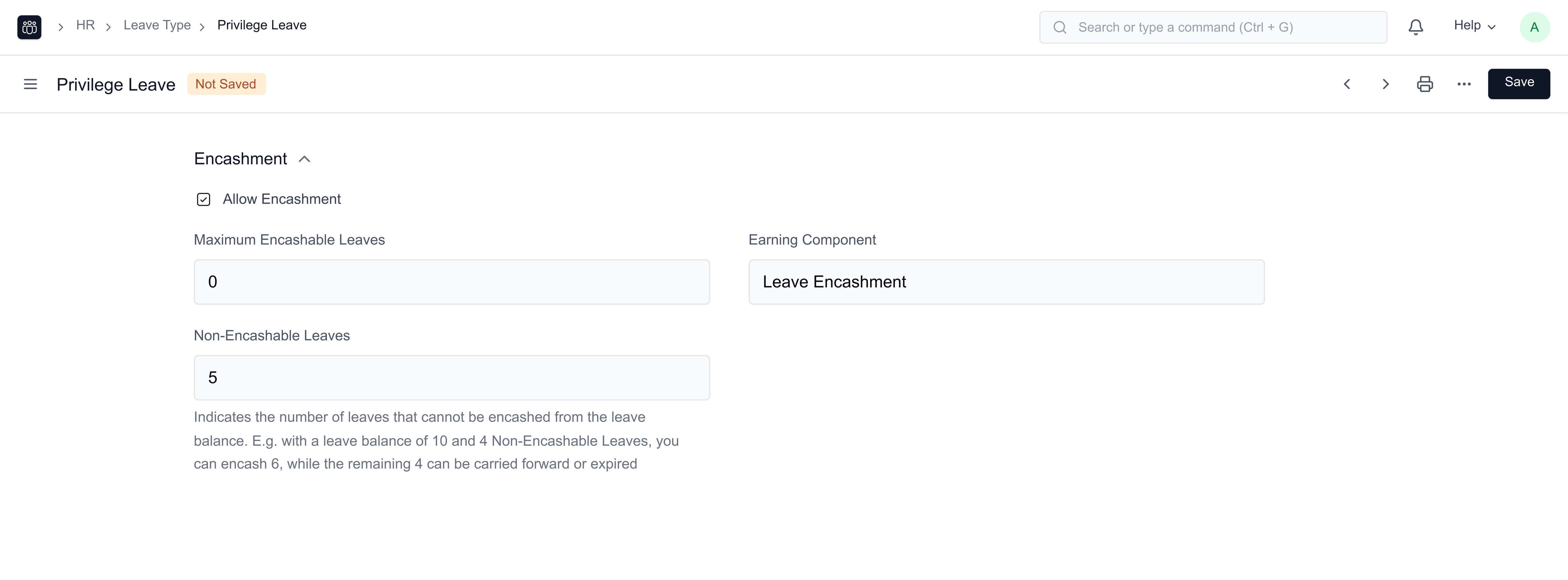 Non-Encashable Leaves: This field indicates the number of leave days the Employees won't be able to encash. Above the mentioned days, the Employee is eligible to encash leaves.