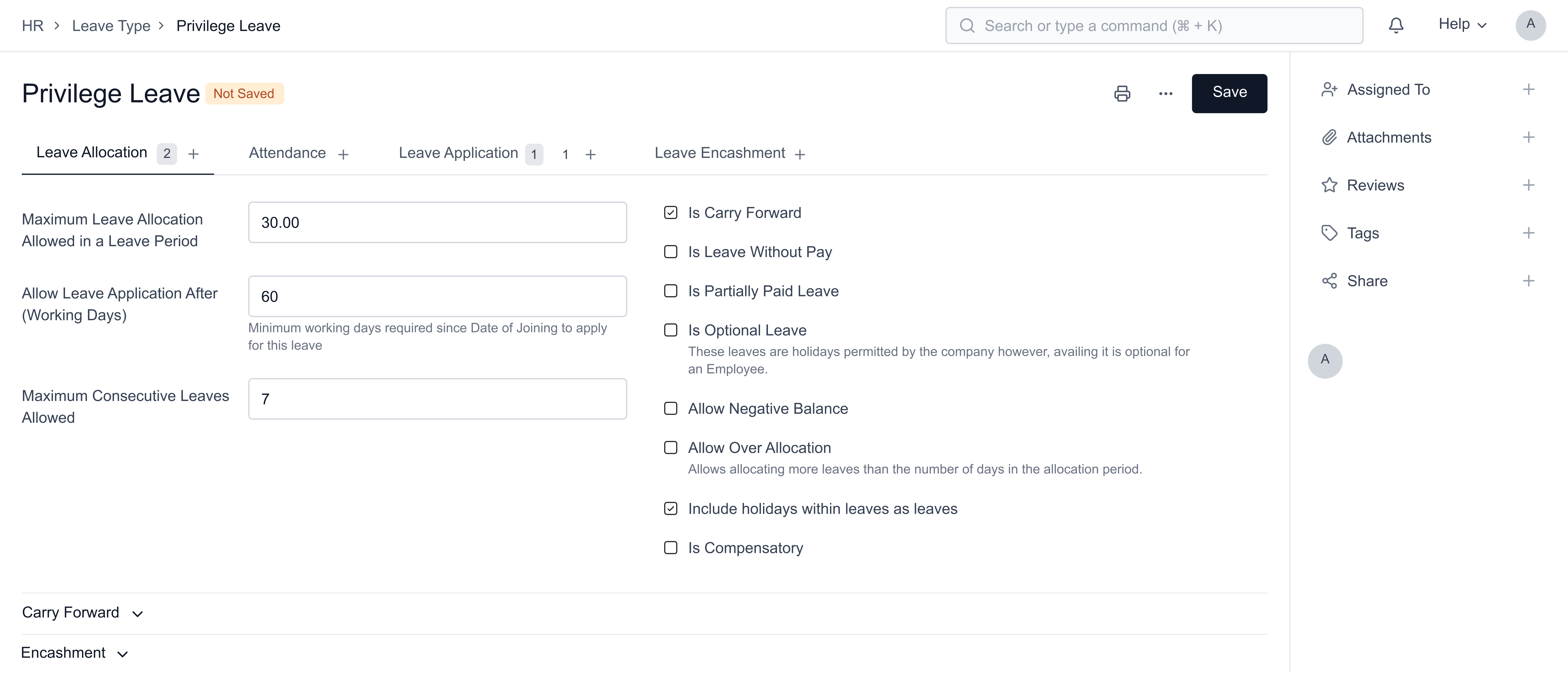 - Enter Maximum Leave Allocation Allowed, Applicable After (Working Days), Maximum Consecutive Leaves Allowed (optional).