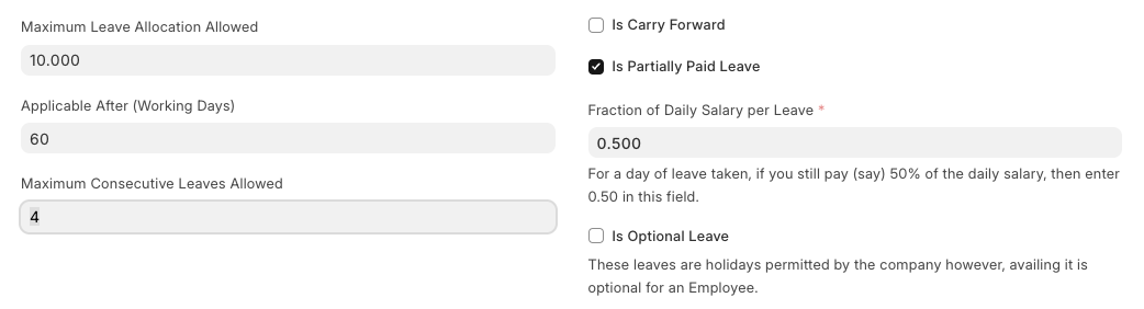 - Is Partially Paid Leaves: This checkbox ensures that Leave Type will be treated as partially paid and some part of daily earnings will be paid through salary slip. If this checkbox is enabled then a field "Fraction of Daily Salary Per Leave" appears where you can define the fraction of daily salary paid on the partial leave day.