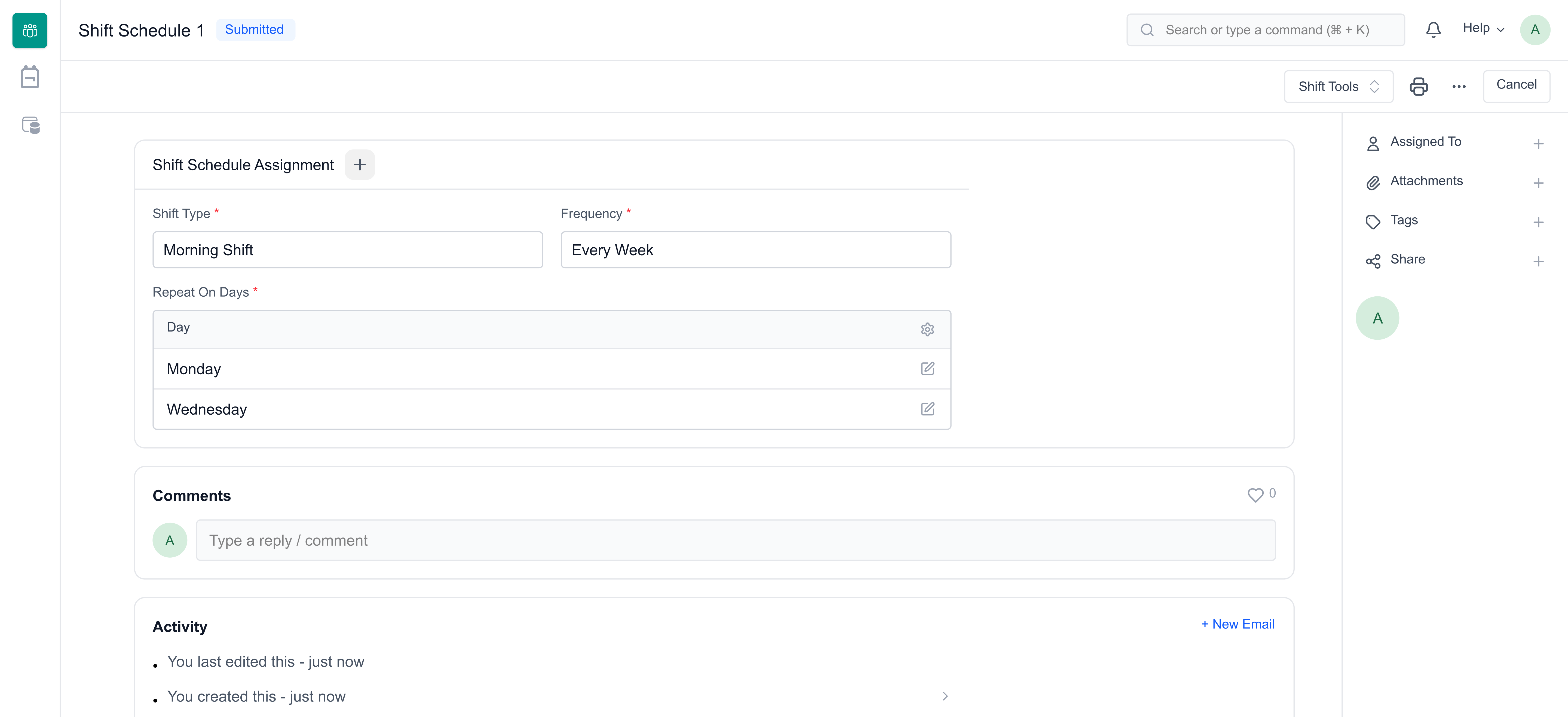 Shift Schedule can be used to create definitions for recurring shift assignments based on selected days and frequency.