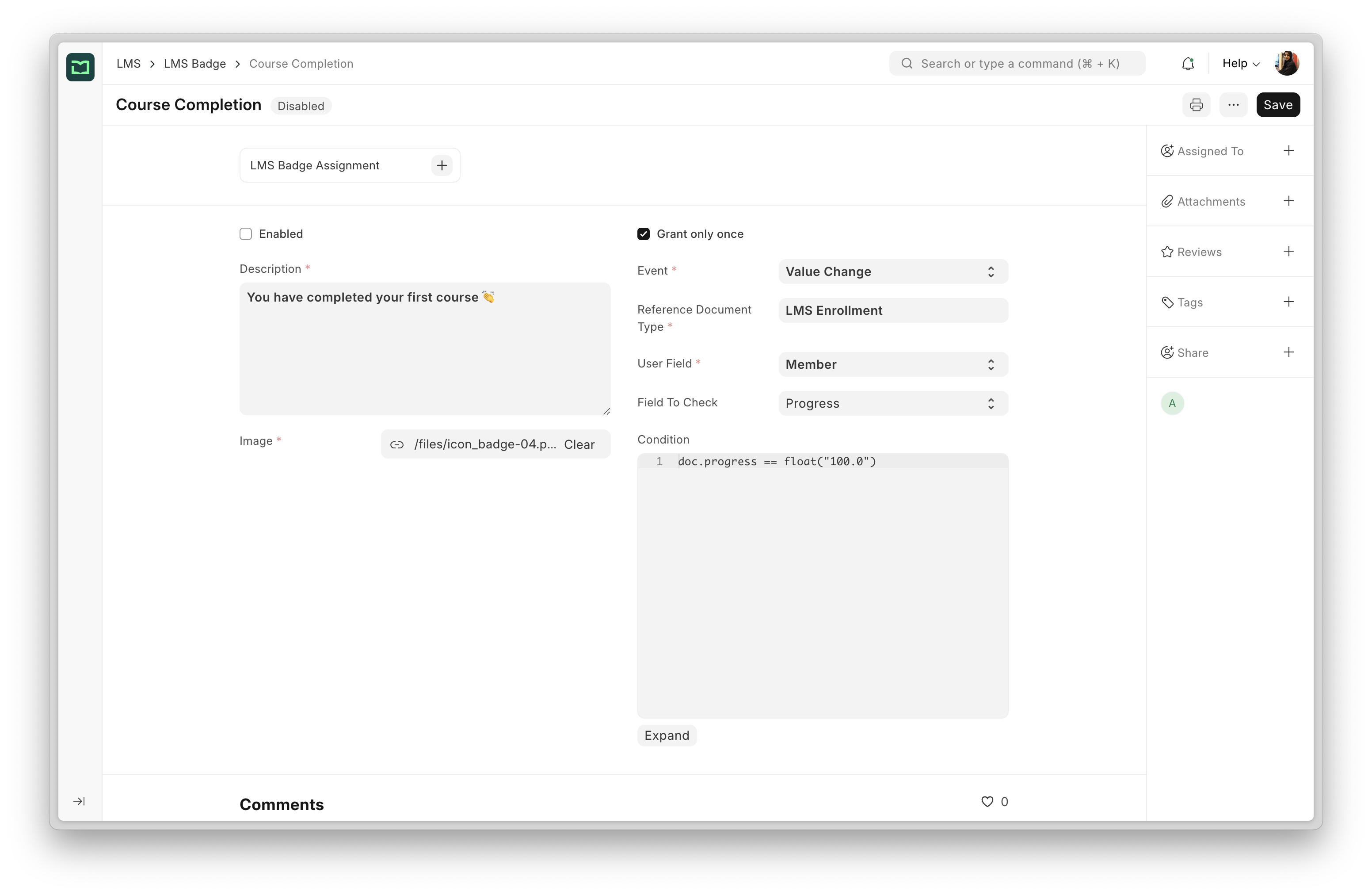 To create this badge the rules would be a bit different. When a student enrolls for a course, a new entry gets created in the LMS Enrollment doctype. Then each time they make progress in that course, the progress percentage gets updated in the same document. So you should select LMS Enrollment as the Reference Document Type and the event will be Value Changed.