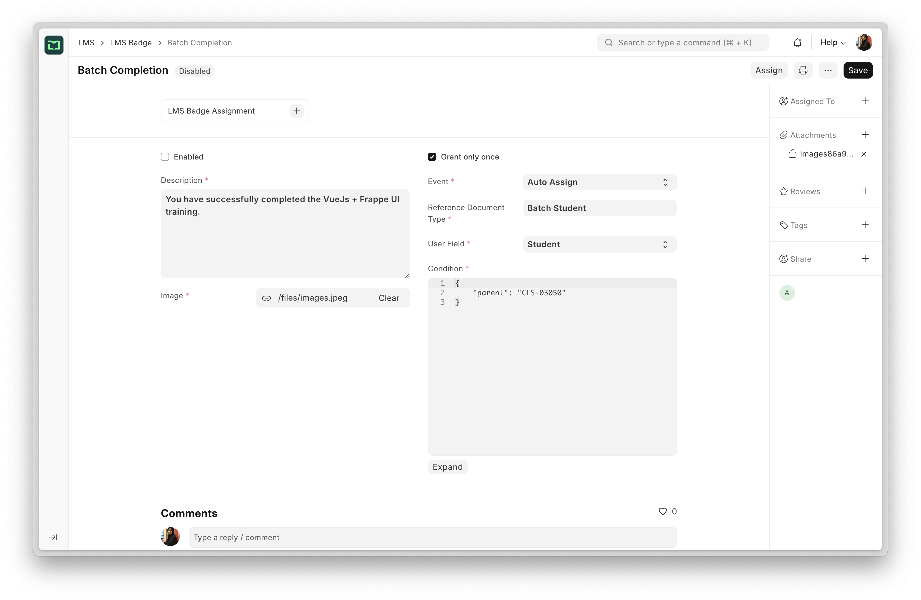 Then you select the Event as New and select the DocType on which this rule applies. As this badge would be assigned on quiz submission, you select the DocType as LMS Quiz Submission.