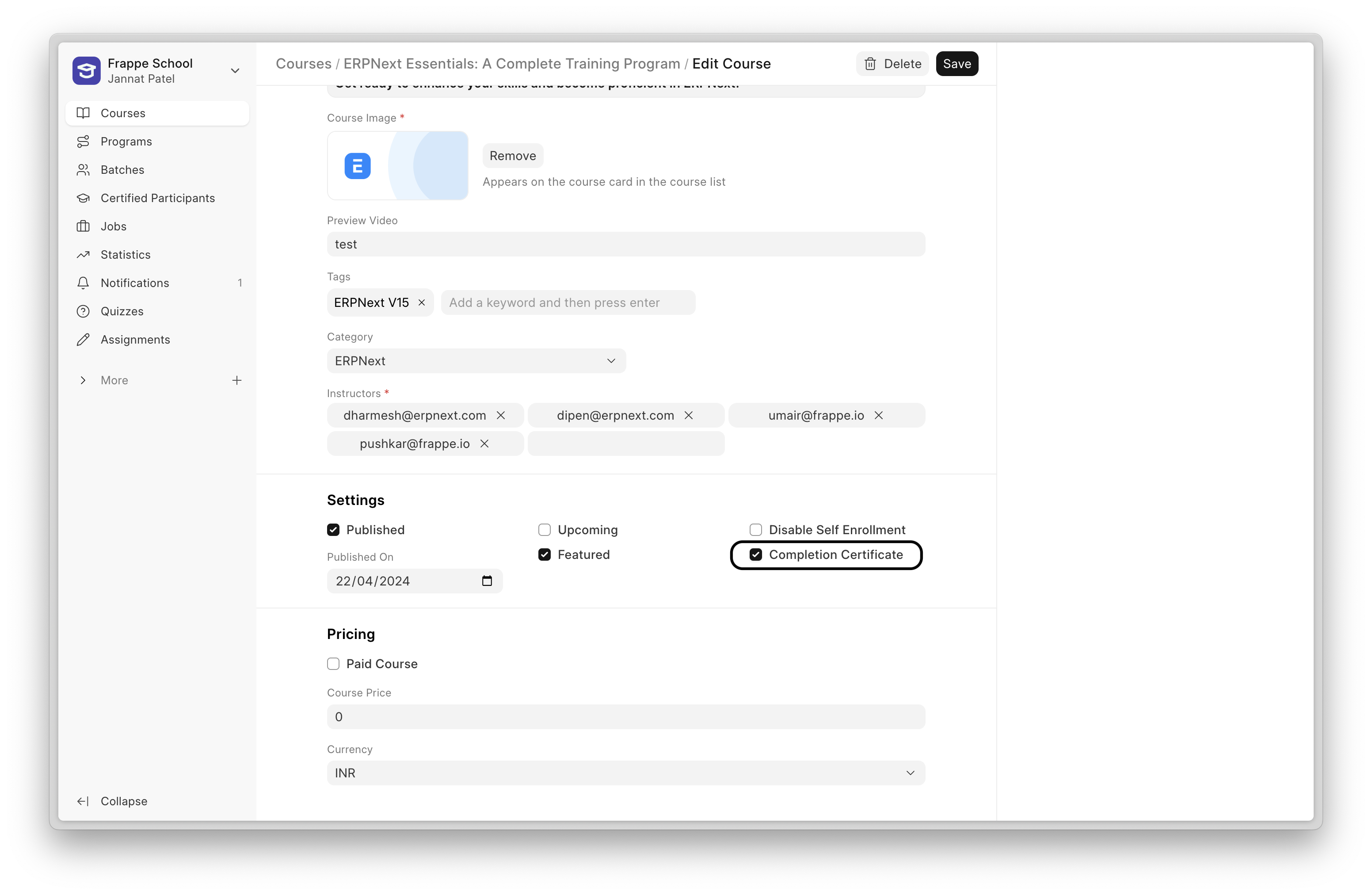 - To enable this, check Paid Certificate when creating a course, enter the amount and currency and select an evaluator.