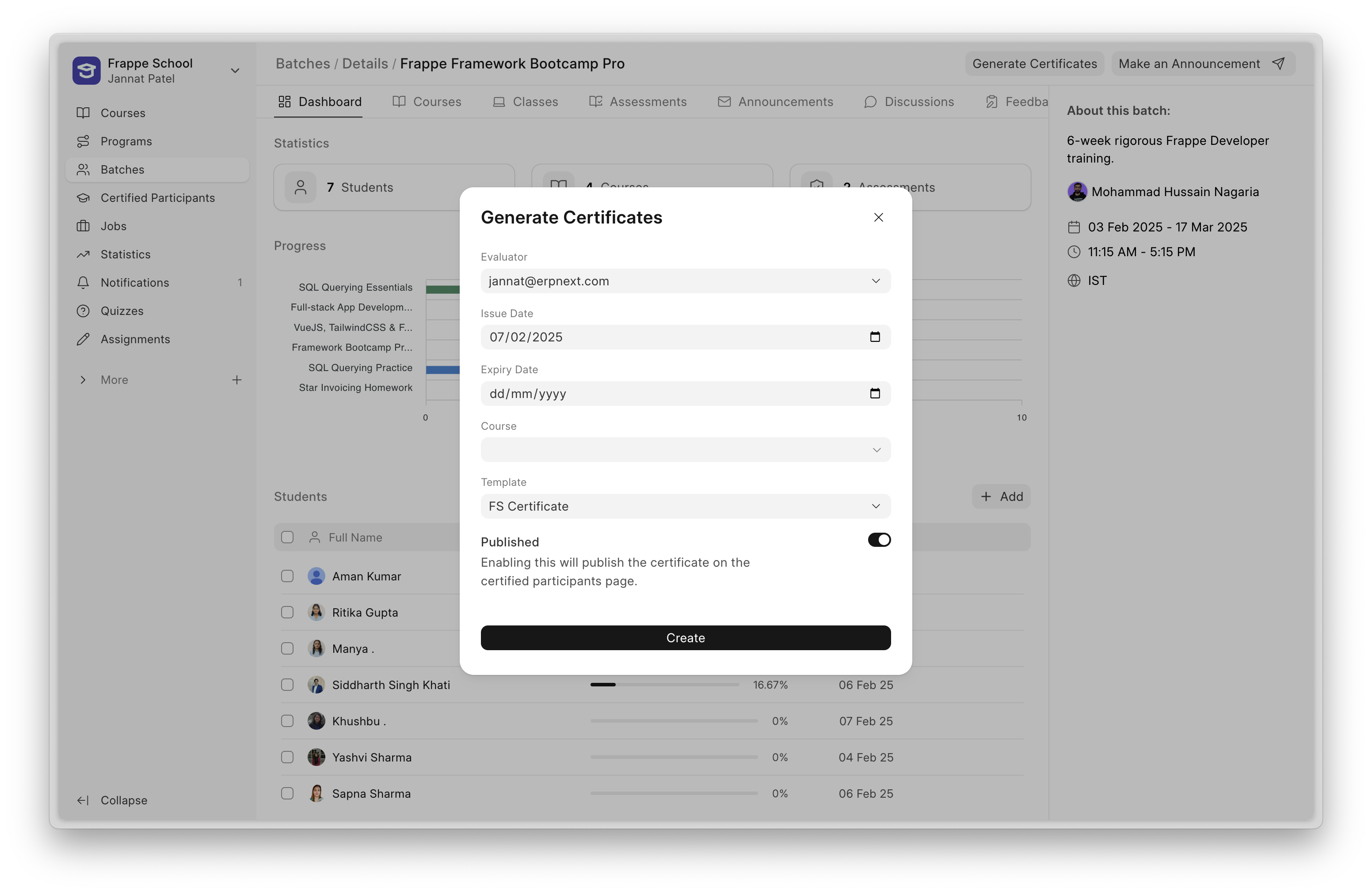 Once you have filled in all the details, click on the Create button. This will generate certificates for all the students in the batch.
