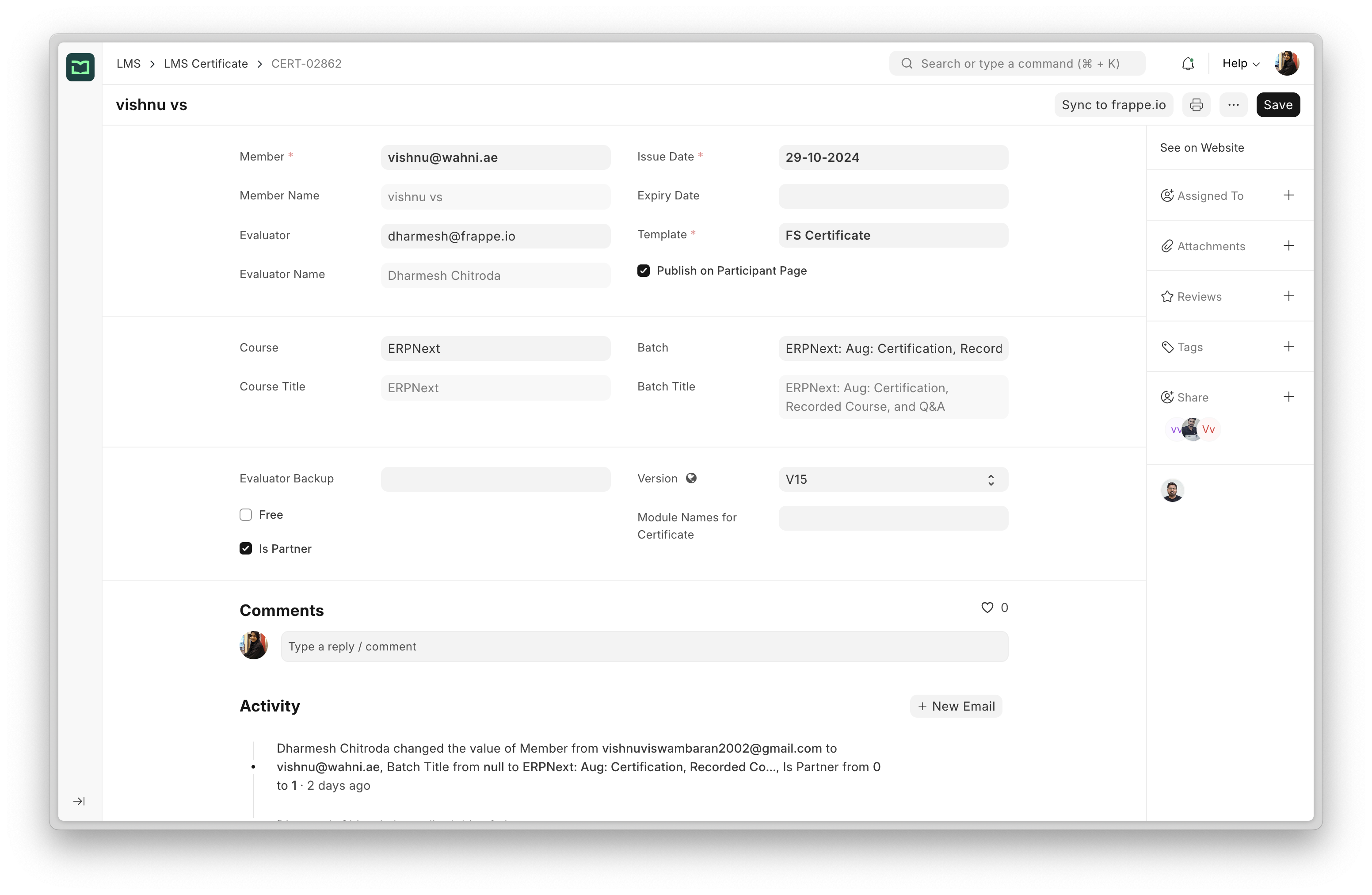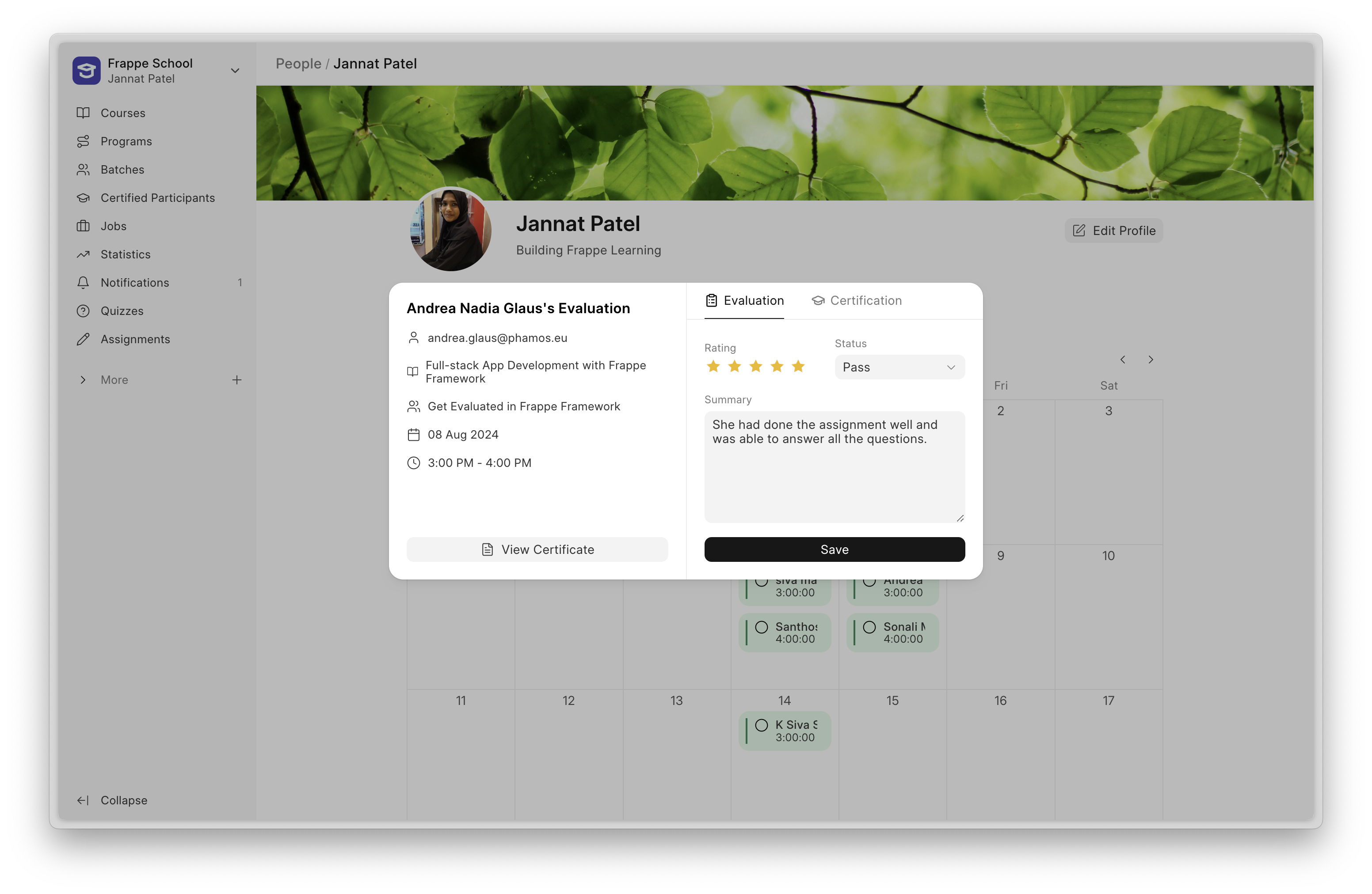 It also has a form on the right, where they can record the evaluation feedback. If the student passes the evaluation, the evaluator can grant them the certificate right from this dialog.